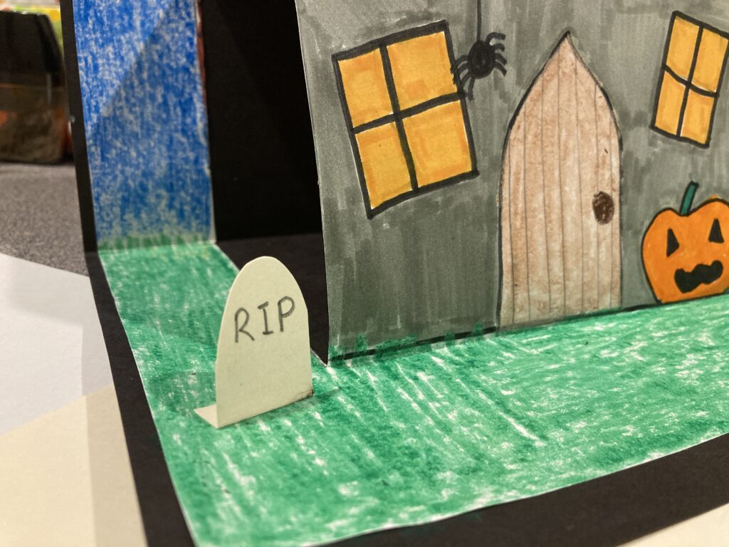 Once your 3D haunted house is done, you can start to colour it and make it your own. Before we started, we stuck our 3 dimensional house onto our back paper. This holds your house up so that it stands. I highly recommend using card stock if you have it as it is much sturdier than paper.