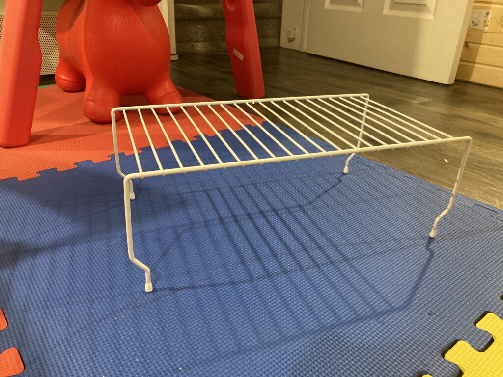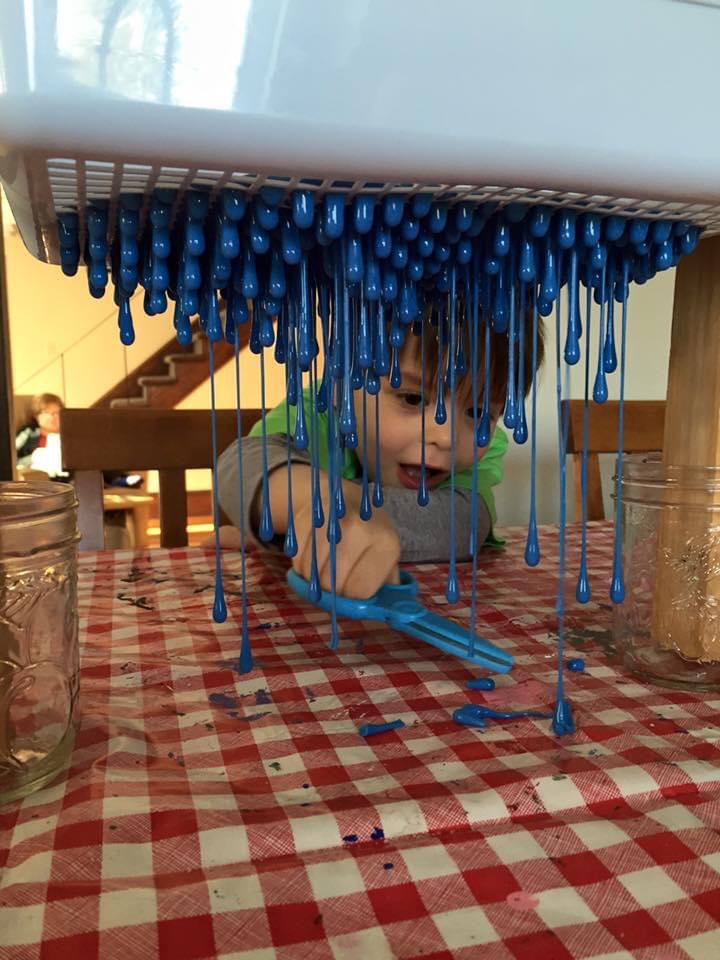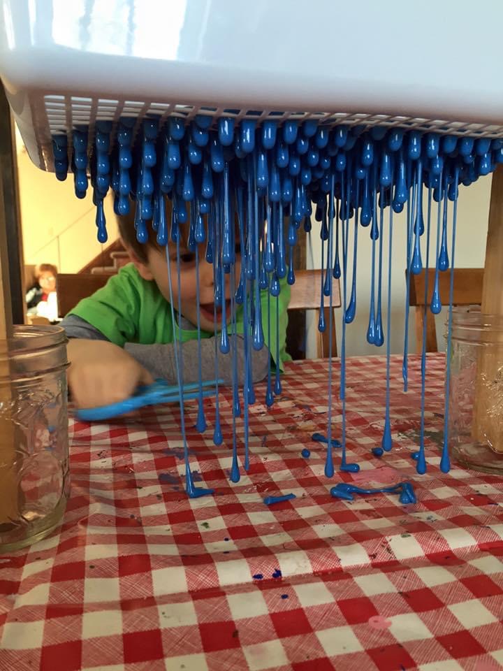Then watch the fun begin. Place the slime over a rack with holes in it. Something like this dish drainer works well.