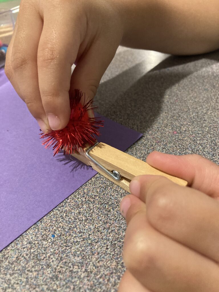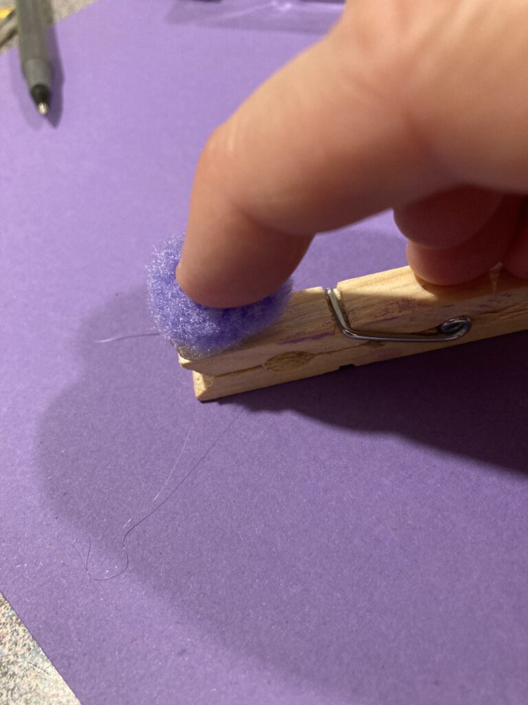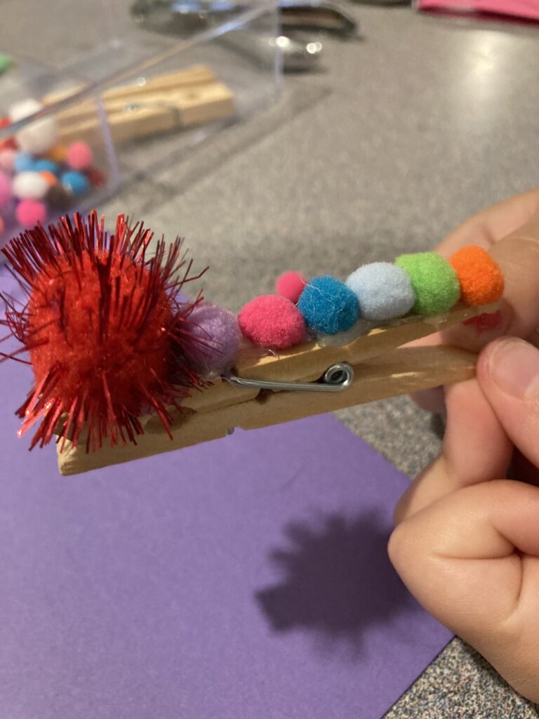 Pick out which smaller colours your child wants for the body and set them aside so you have them ready to stick on. Depending on how big your pegs are, and how close you put them together you should be able to fit about 6-7 smaller Pom Poms along the peg.