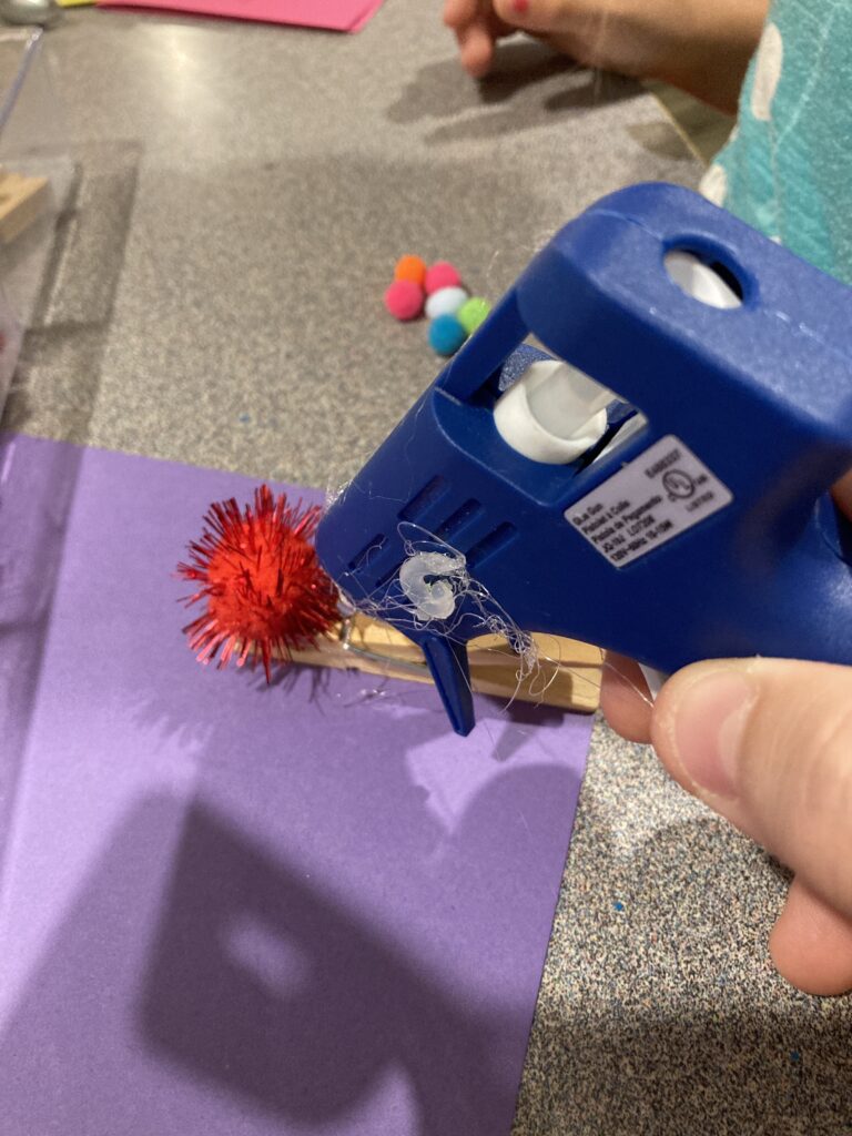 The larger Pom Pom is glued to the end of the peg which opens. If you are using hot glue, hold the Pom Pom down onto the peg for about 5 seconds. It sets pretty quickly!