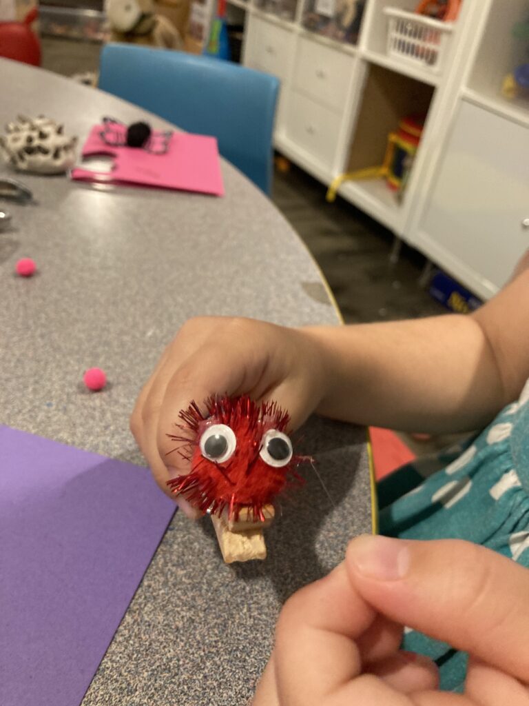 Start off picking out a larger Pom Pom. This will be the head. An adult may need to help smaller children with gluing the Pom Poms on. Regular glue works too, but kids will have to wait for them to dry. We find hot glue is great for these crafts. But it is personal preference, and regular glue is good when doing these in a pre-school setting.