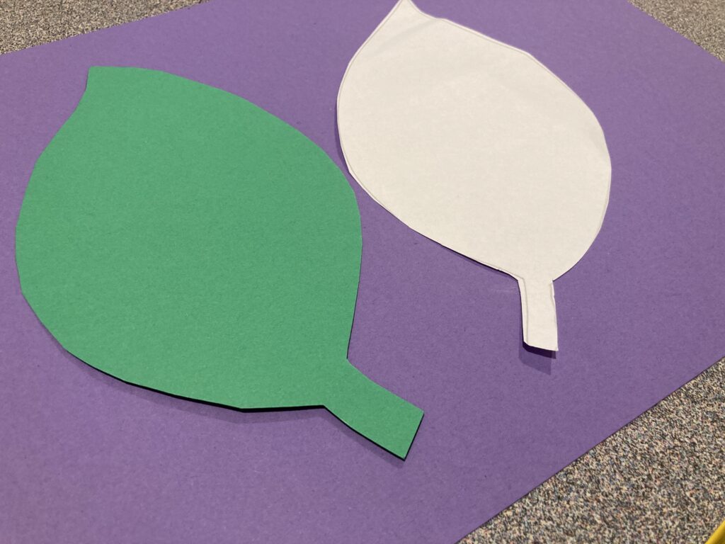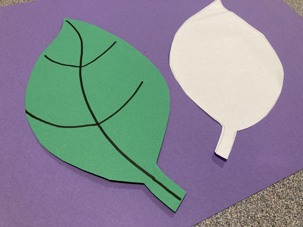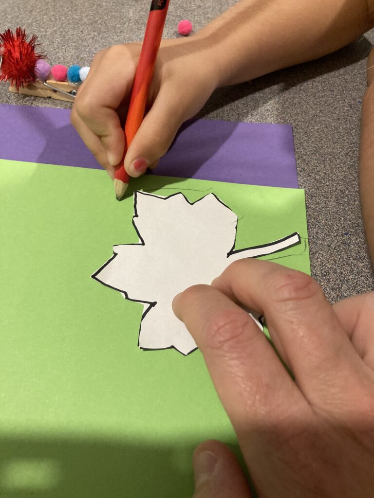 Have a template ready so you can have your child draw around it. You can use one of our FREE printable Leaf templates if you don’t have one.