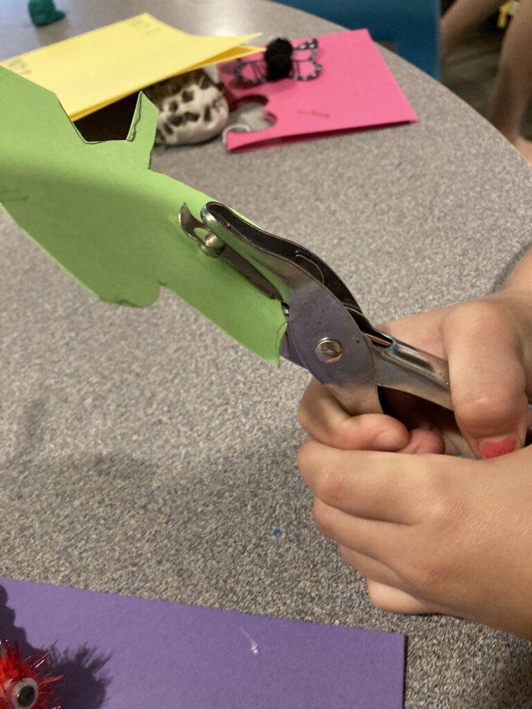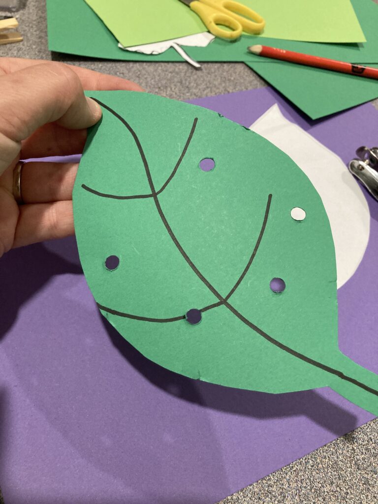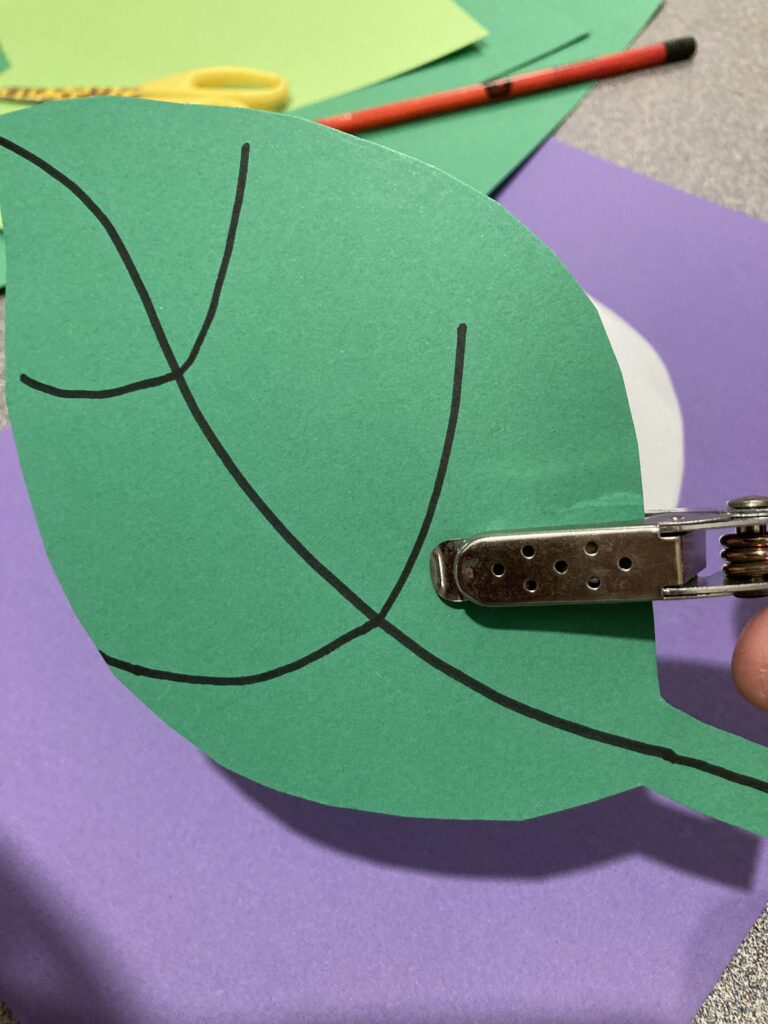 Next using the hole punch, punch random holes around the leaf. This is just for show and can be where the caterpillar has eaten from. 🐛😍