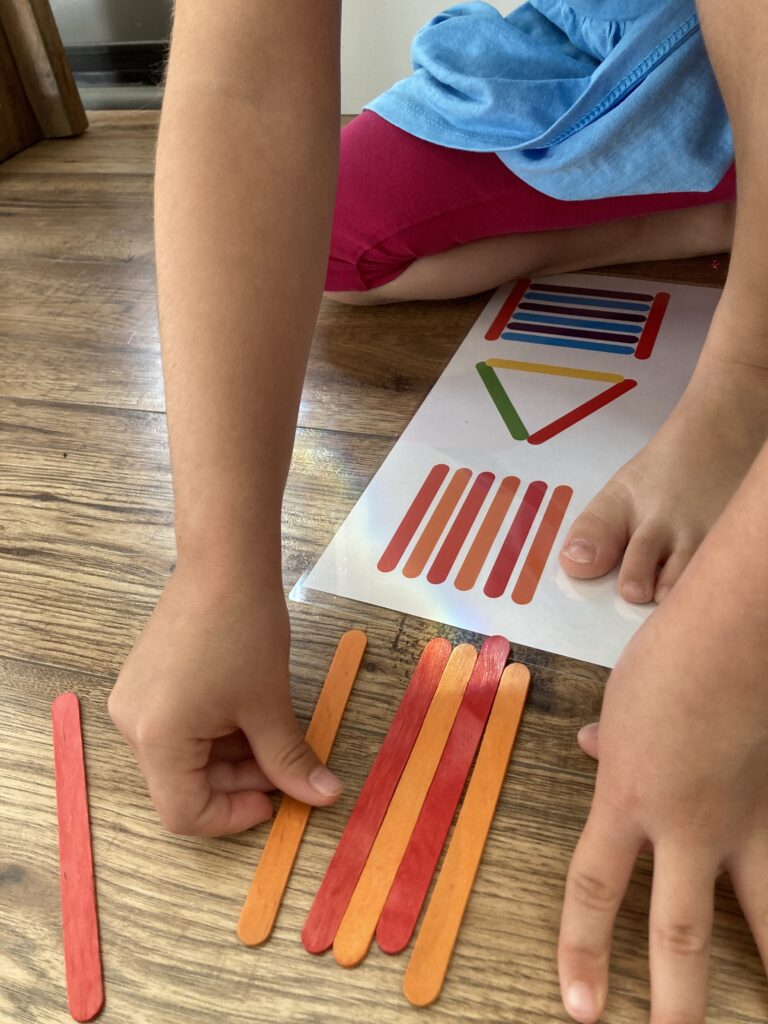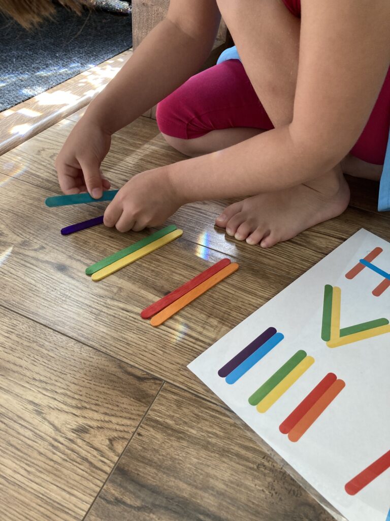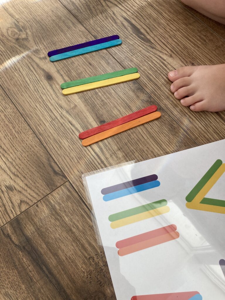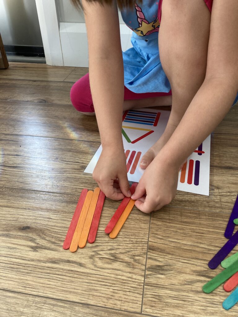 My 4 year old daughter found some of these pretty tricky. We had to call out the colours that we saw on the cards so that she could hear the pattern. Then she would repeat it while placing the sticks down.