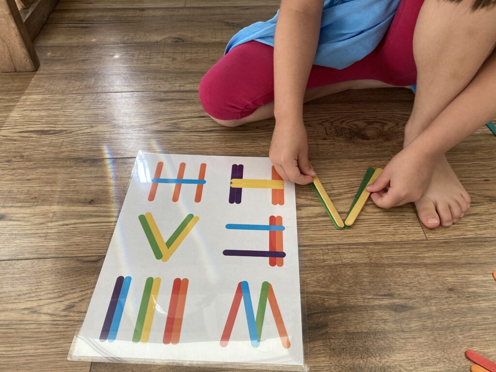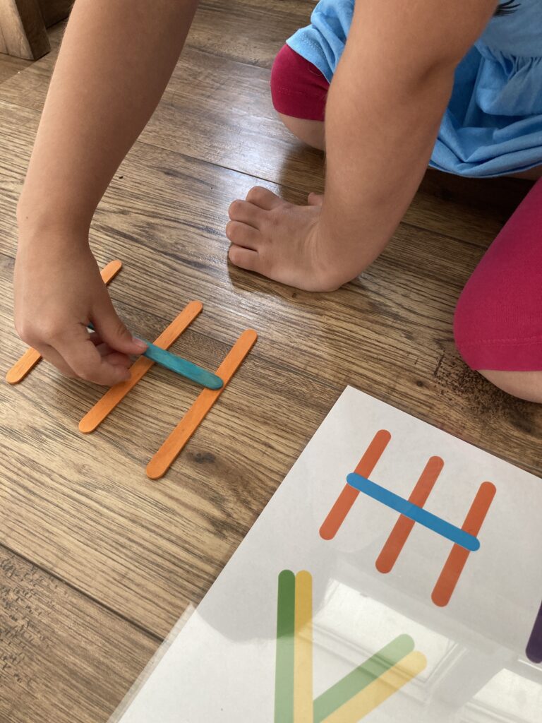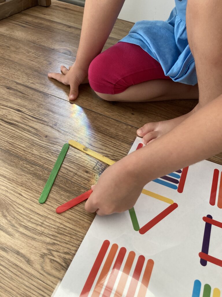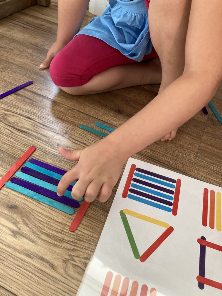 My 4 year old daughter found some of these pretty tricky. We had to call out the colours that we saw on the cards so that she could hear the pattern. Then she would repeat it while placing the sticks down.