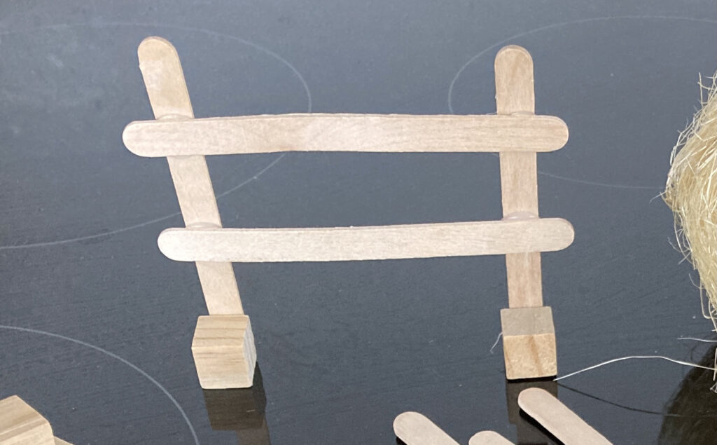 I also made some fences that were easy enough to build. Just use 4 craft sticks and cross them over to make a fence shape. Use hot glue to secure the pieces and then stick a cube on each vertical stick so that your fence stands up. Hey presto you have a fence!