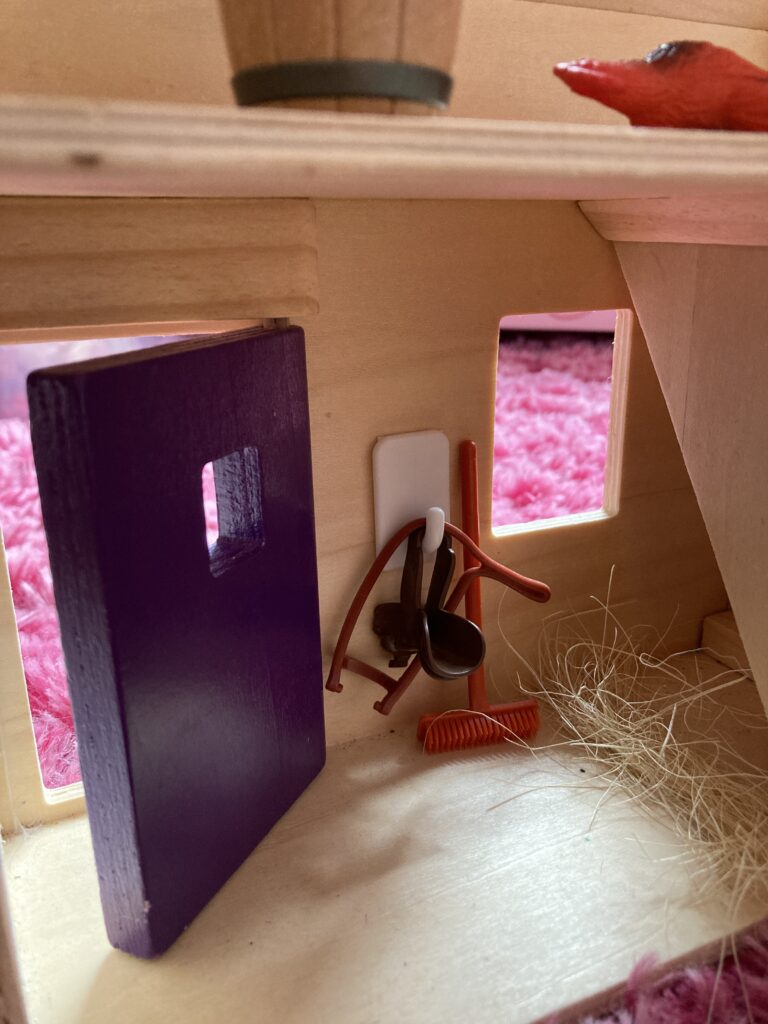 We were going to paint the house red to make it more barn like but my daughter LOVES pink so we left it the way it was. We added a couple extra touches like some plastic stick on wall hooks. This was so that she could hang her saddles, reins or any other horse items.
