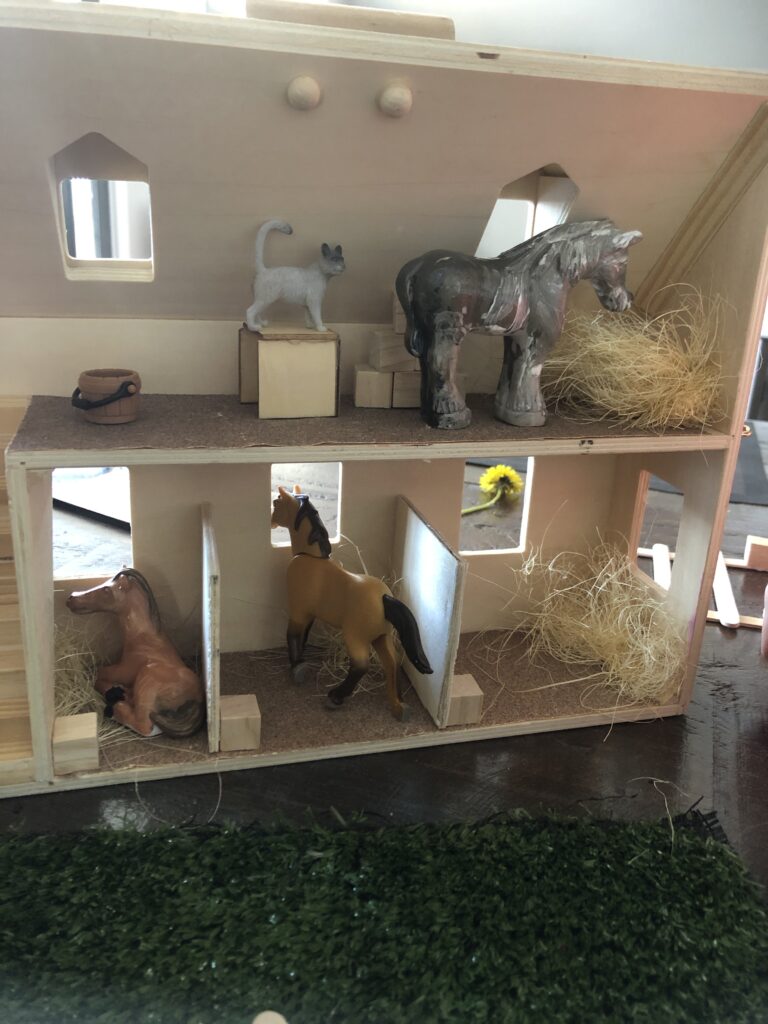 The next step was decorating it with ‘hay’ to make it look like a barn. We found some fake straw that we used to put in each stall. It comes in a ball so you have to cut it off in chunks, then we stuck it down with hot glue. We also stuck some on the top floor to use for any other small animals like barn cats or hens. My daughter puts her horses upstairs too but each to their own I guess lol! 🤦♀️