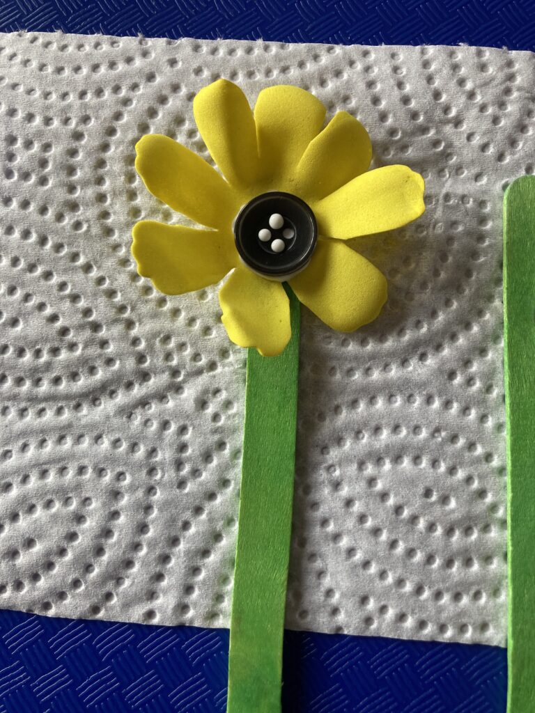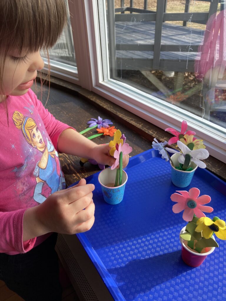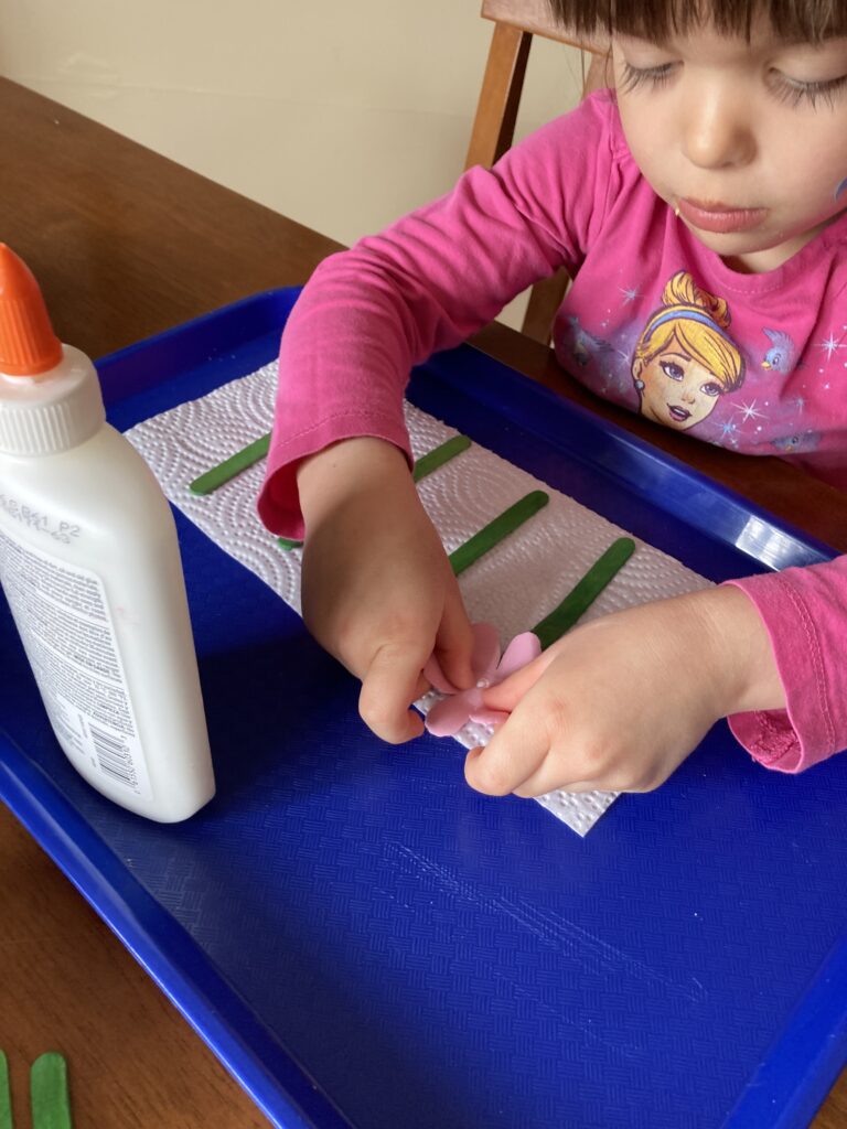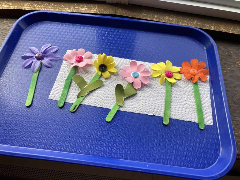 Have your child line up their craft sticks and pick out which colour petals they want for their flowers. They can have as many flowers as they want as long as their cup is big enough to fit them all lol!