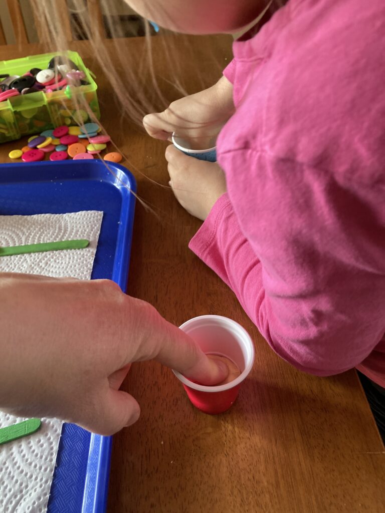 My daughter then picked out which buttons she wanted to put in the middle of her flowers. Buttons are pretty easy to come across. Most of us have them in our sewing box 😂but you can also get fun colours in packs from craft stores.
