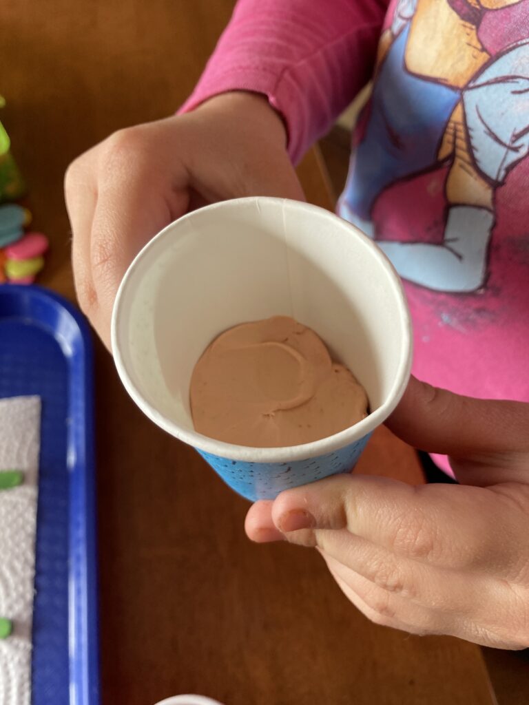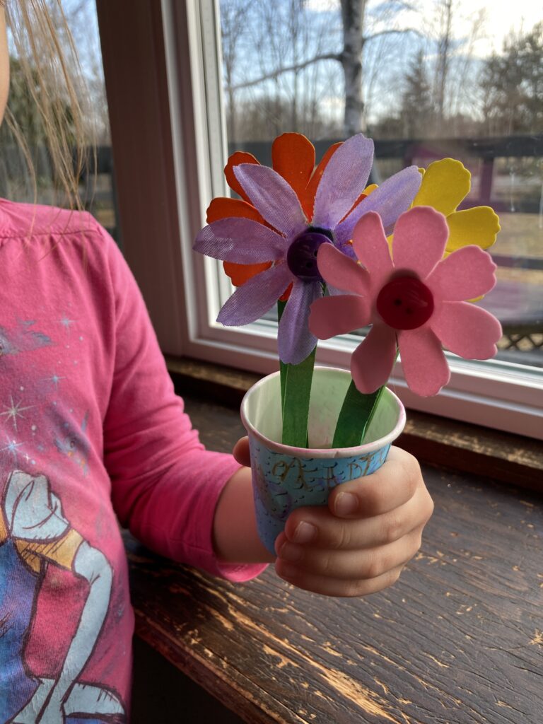 When your flowers are dry, have your child push them into their cup. They should be able to do this by themselves but you might have to help a little if the flowers keep falling over.