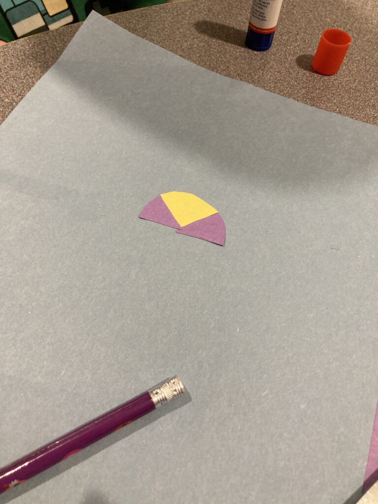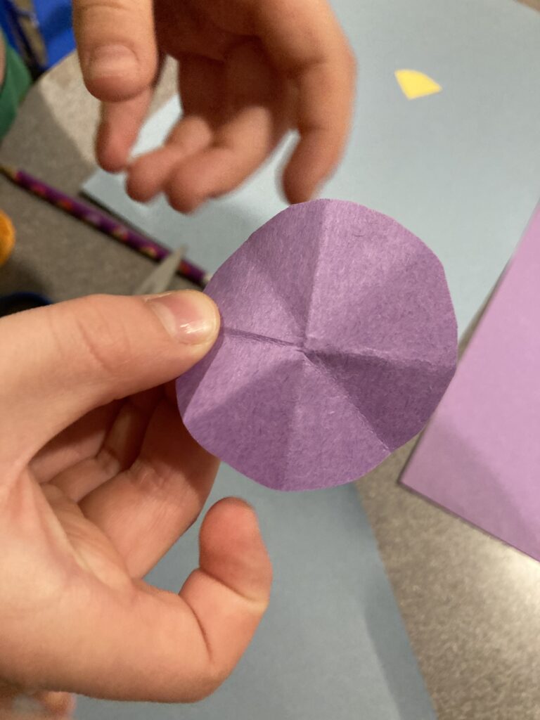 Next we took another circle of a different colour and folded it one extra time to create eighths. We then cut out 4 sections of this circle so we had smaller ‘pizza shaped’ slices than the first circle.
