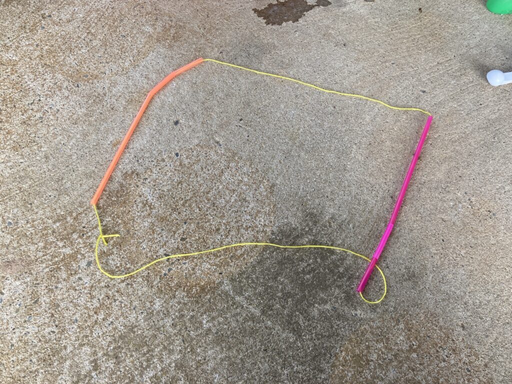 To make a DIY bubble wand, all we used was a couple of straws and some string. The string is threaded through both straws and tied in a knot. As pictured.
