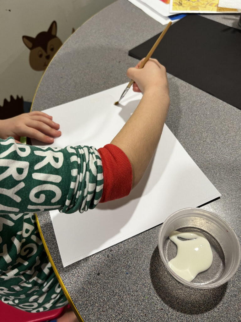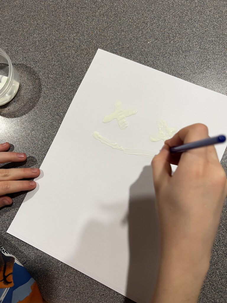 The kids started out by painting their pictures with the paint and writing their secret art. You can write secret messages or paint something and have your friends or family guess what you are painting. Doing it on white paper is better to start with but if the kids want to see their art as they are painting you can also use black paper.