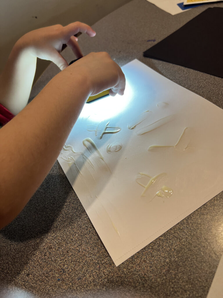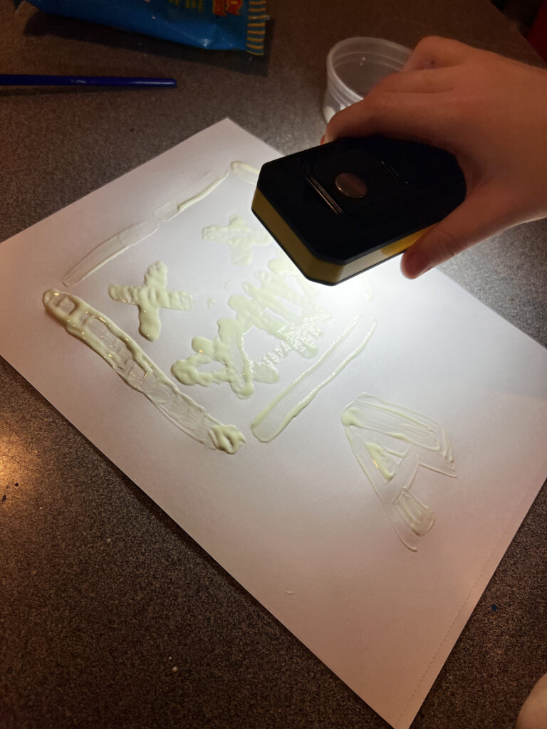 The kids loved their art show up once the lights went out. We were so surprised to see it actually work. And you can keep charging it again and again. Once our art was left to dry we ‘charged’ it up again and it still worked.