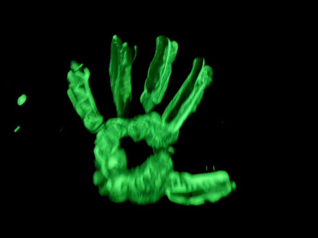 Once we saw how effective the glow in the dark paint was, we decided to try doing some hand prints. My daughter was desperate to get her hands into it. We done the hand prints the same way as you would do any hand print. E painted her hand and pressed it down onto some white paper. We then shone our flash light onto her hand print and turned off the light. So fun!