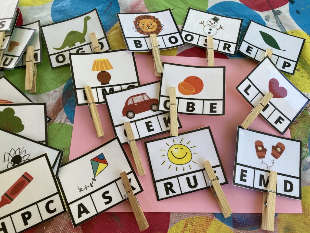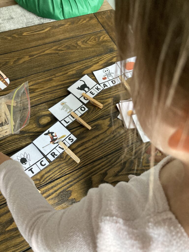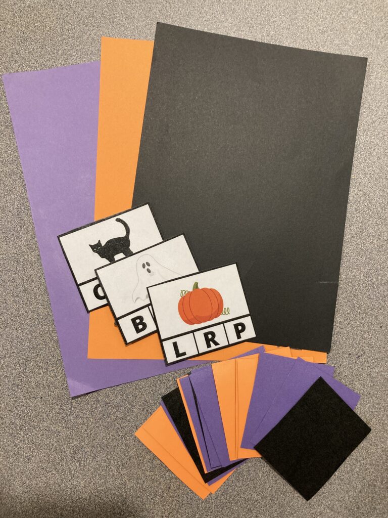 Gluing the letter sound cards onto card stock just made them more durable and easy for children to hold whilst placing the pegs. I used halloween colours to stick ours onto but you can use regular white card or whatever you have.