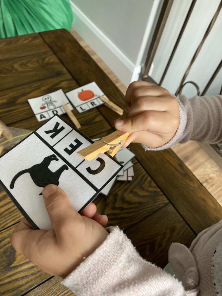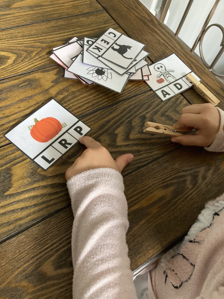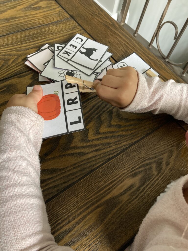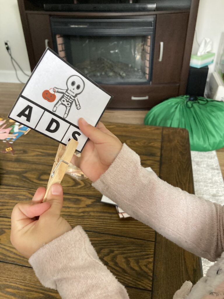 I had my daughter say the word and point to the letter she thought made that sound. She loved the pictures of all the halloween items and shouted out what they were! Pictures always make learning more fun for preschool children.