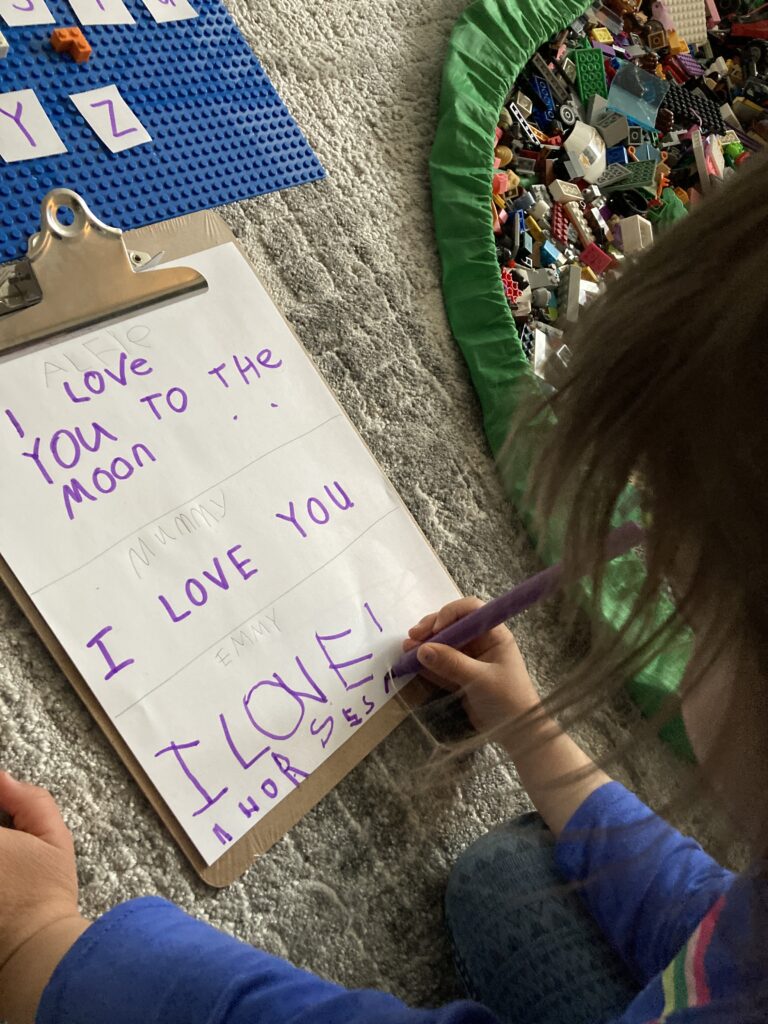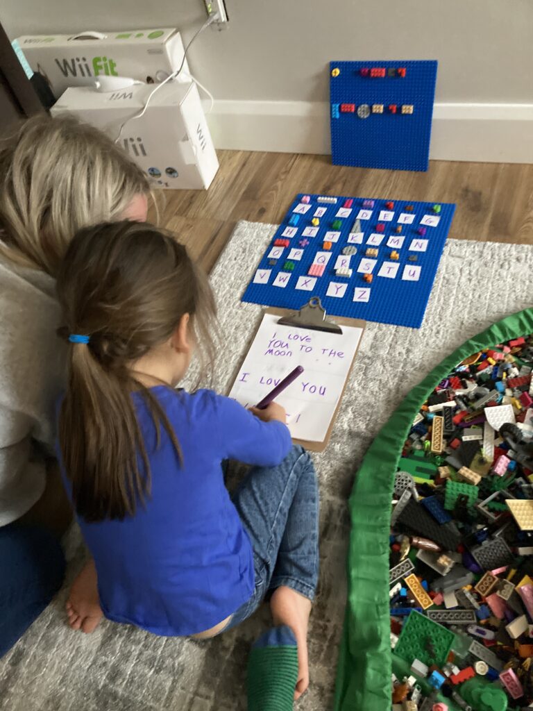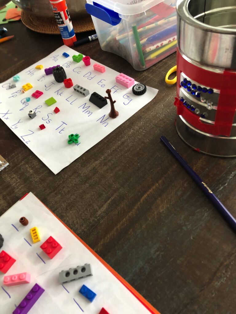 Then your child has to look and find the correct letter that corresponds with that lego piece. Your child will then write out on a separate sheet of paper the letters he sees.