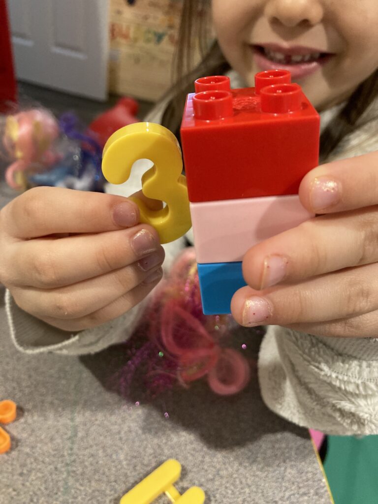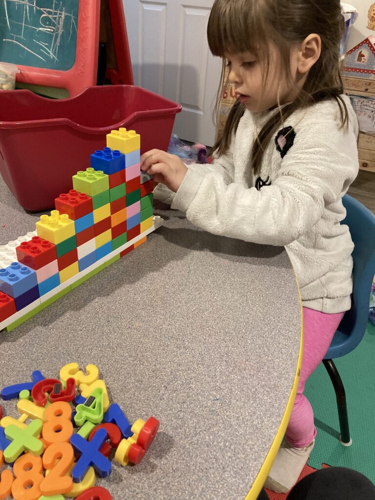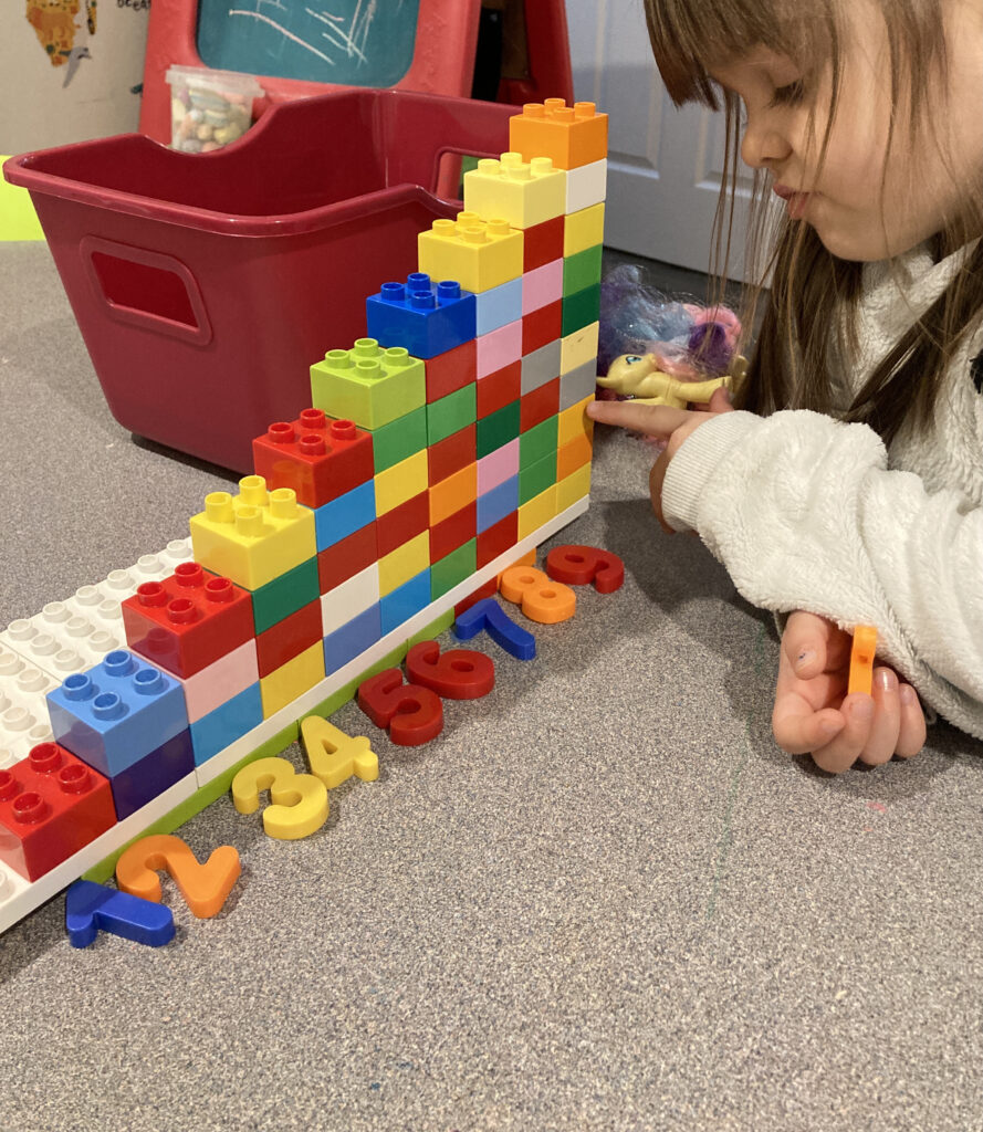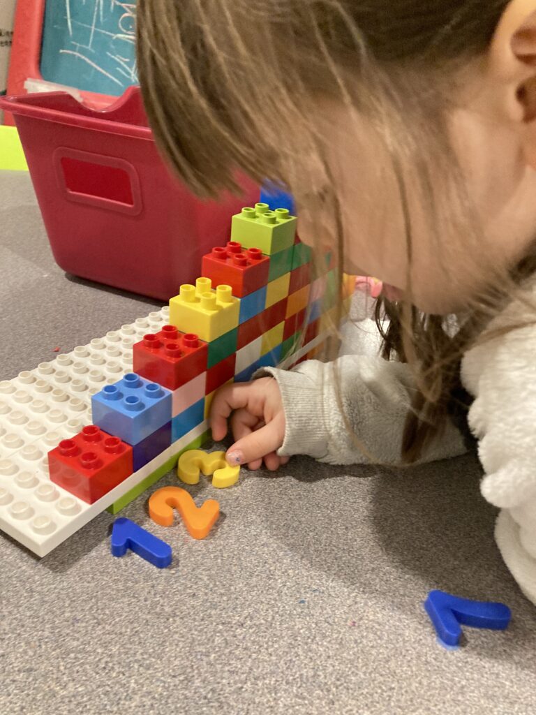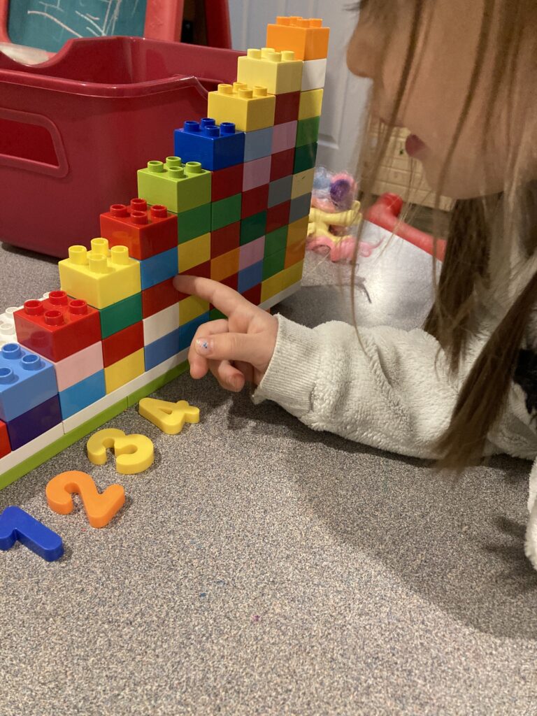 My daughter can recognize numbers from 1-5 but struggles after that so this activity helped her to become familiar with the numbers. We worked only to 10 to start us off. We stacked up the Duplo in towers starting at 1 and working up to 10.
