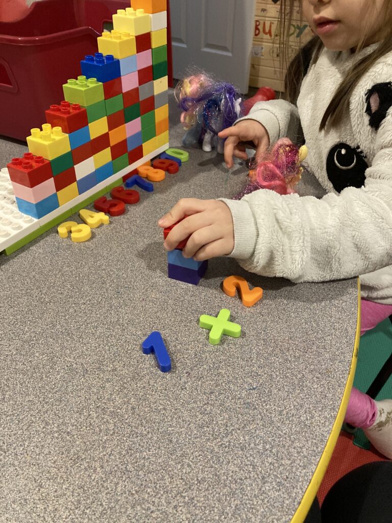 Next we took it to the next level and introduced addition. She has seen her big brother do addition before and he will often get her to add up by using her toys or snacks. So we thought we would give this a try using the Duplo and numbers.