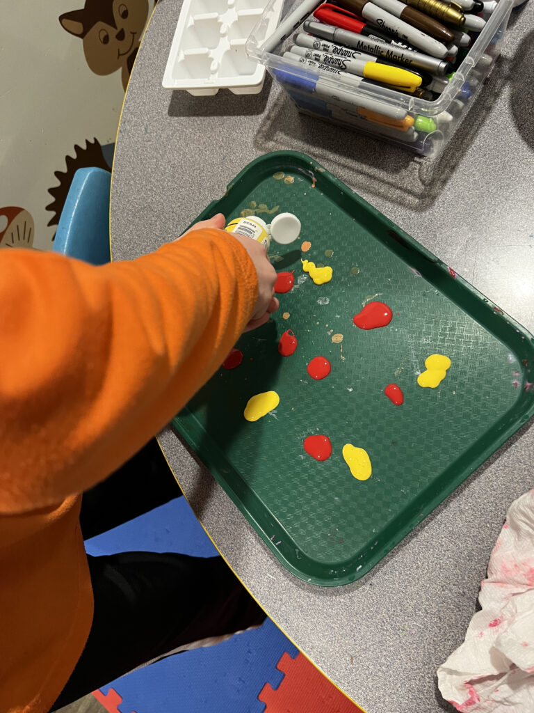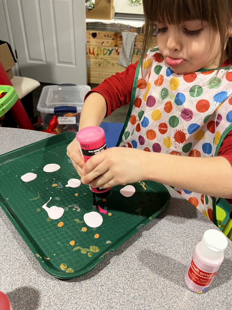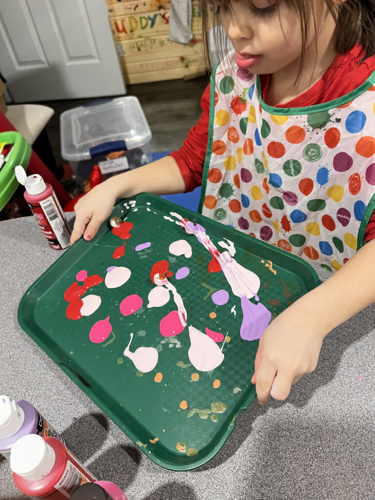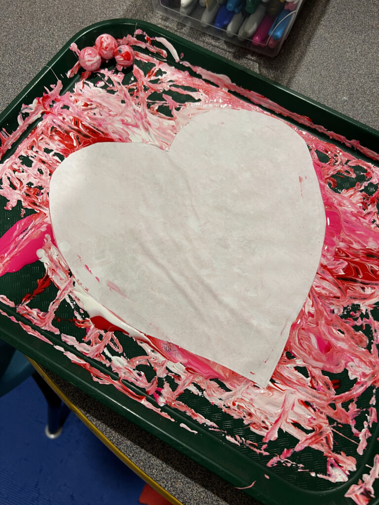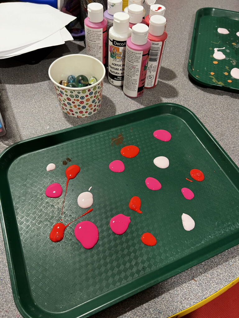 Pick out whatever colours you want your heart to be. Make blobs of paint around the tray for the marbles to roll in. The blobs don’t have to be huge. It will help the marble to roll a little easier if you use plenty in smaller amounts.