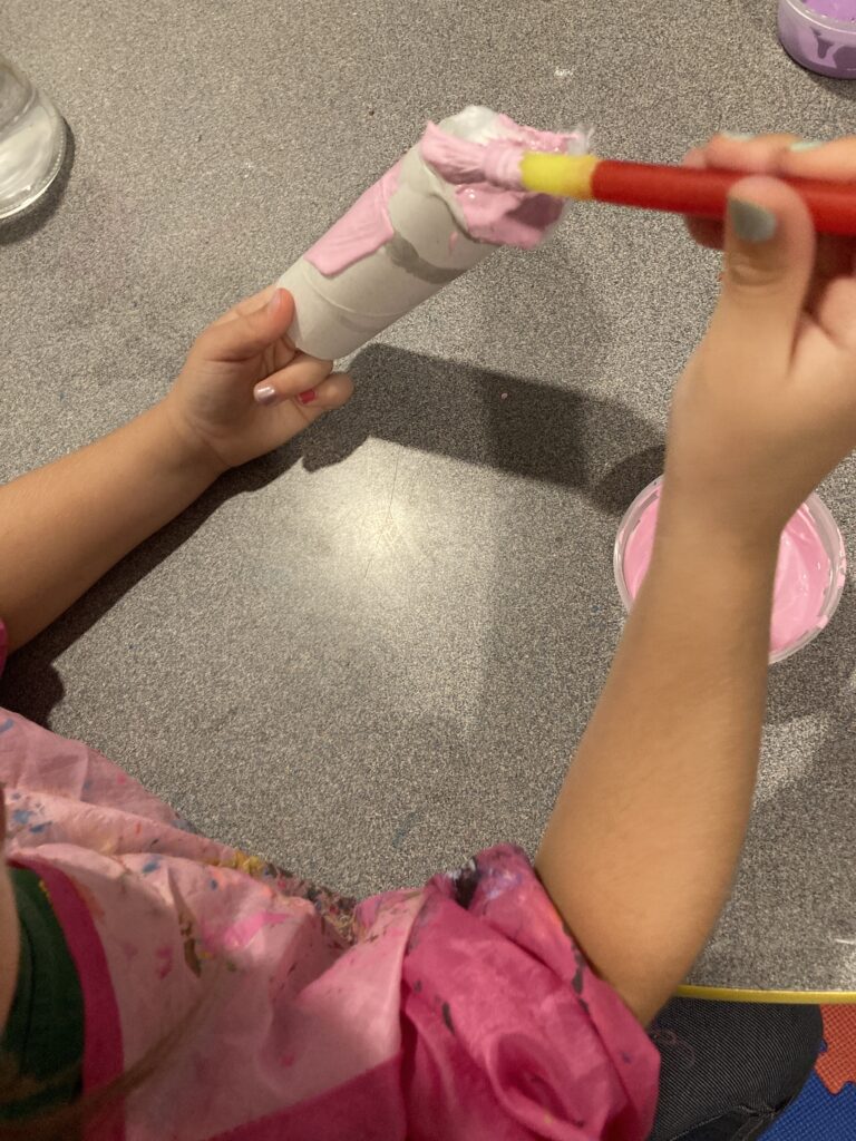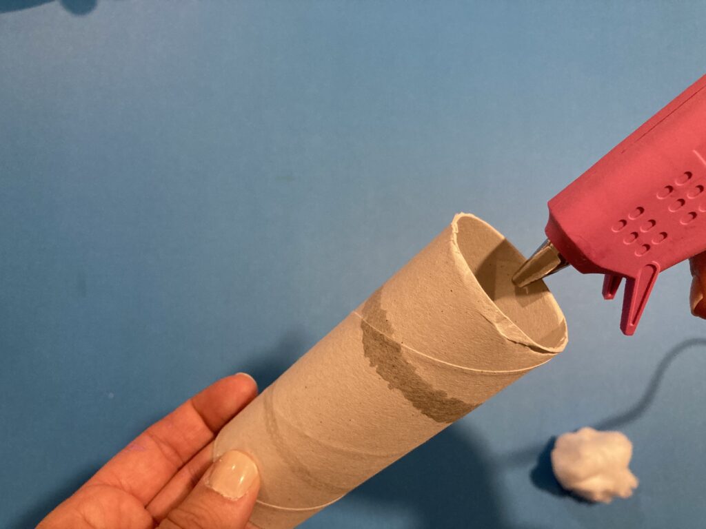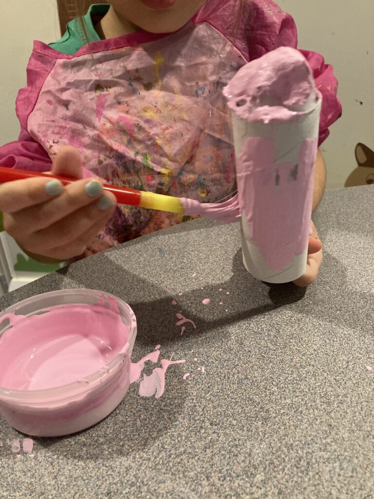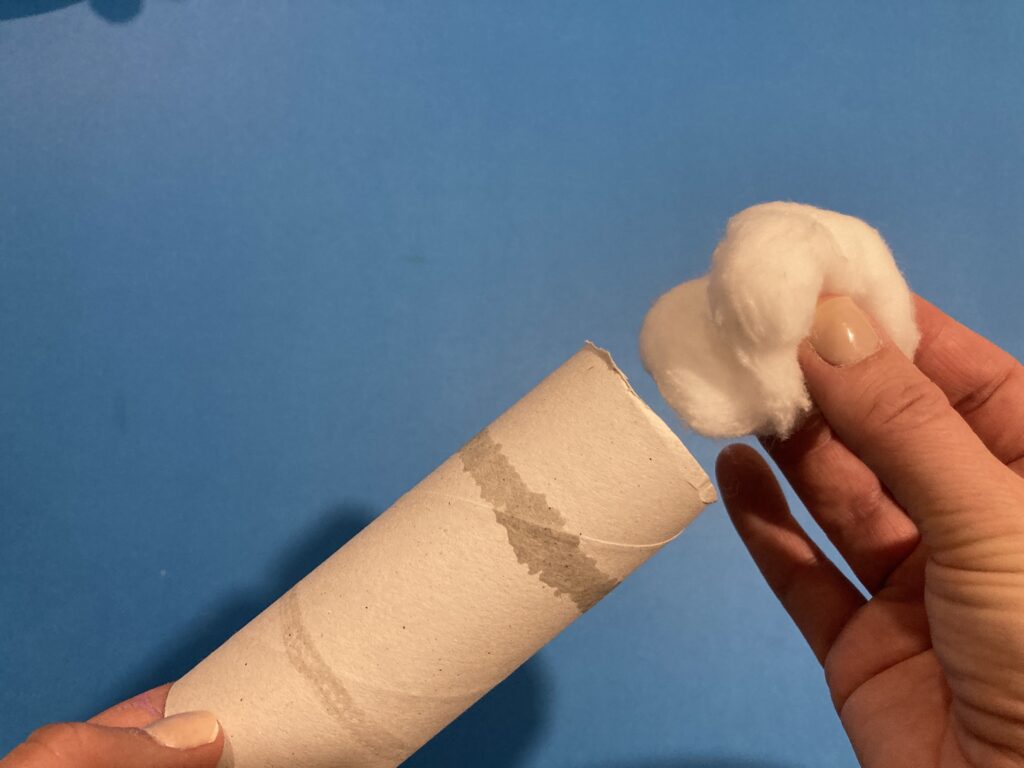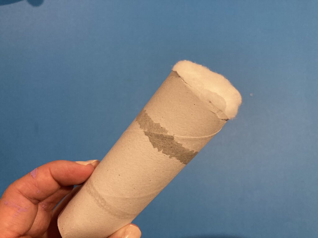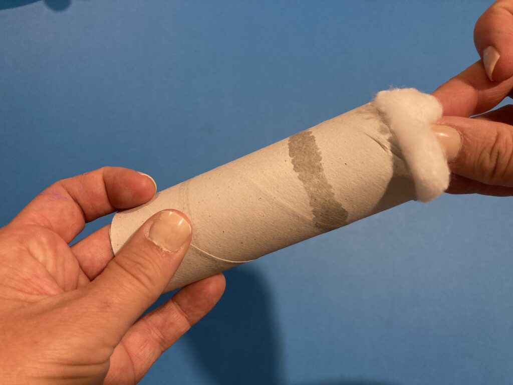 Paint the tube all over including the top where the cotton wool is. It is easier to pat the paint onto the cotton wool so that the brush doesn’t start to drag stray pieces of wool. Then set it to dry.