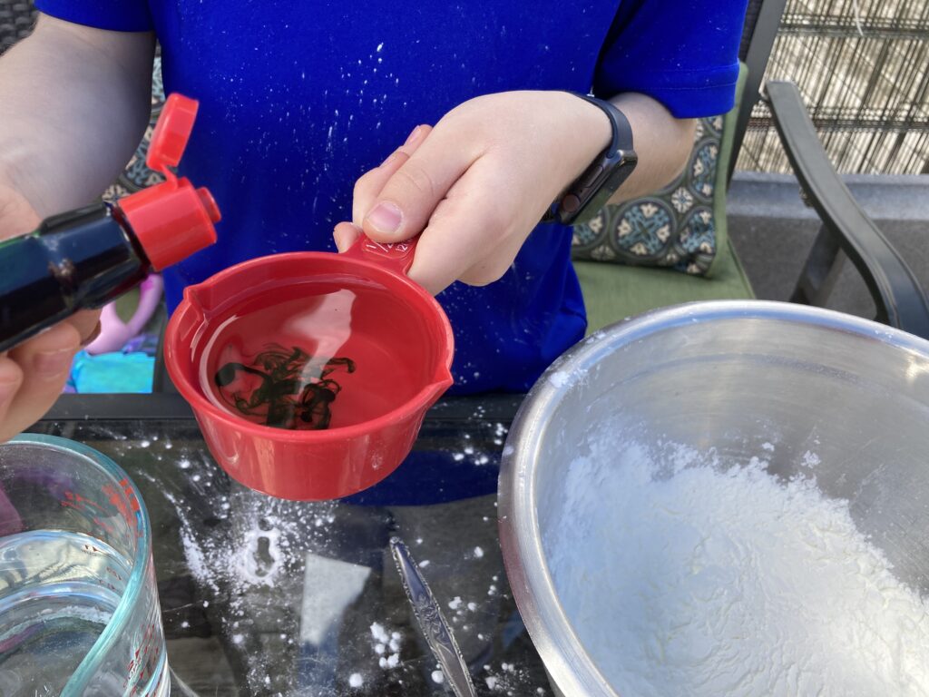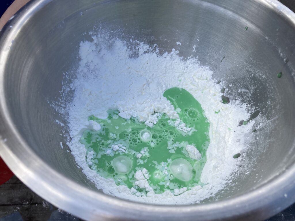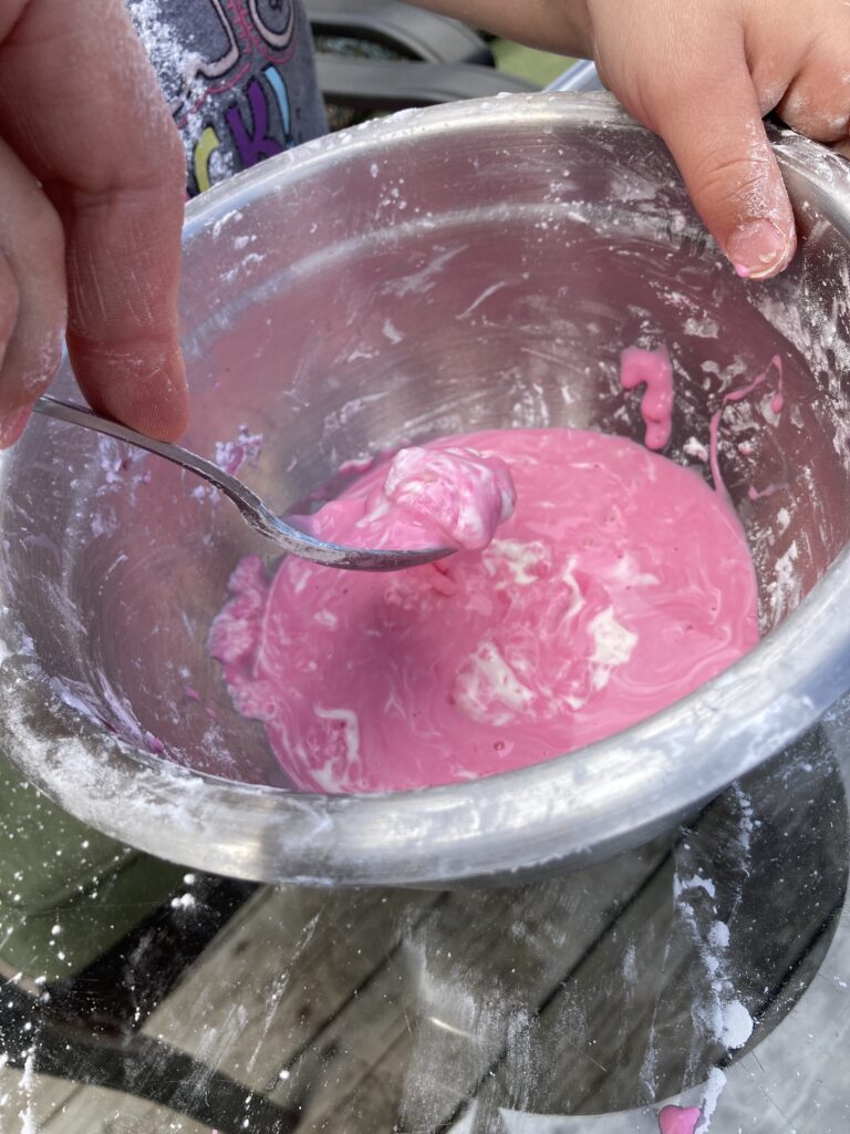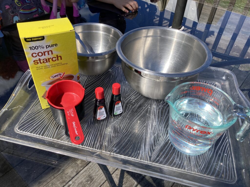 Start by mixing the corn starch and water together. You can add a colour to the water before it goes into the corn starch. This just makes it a little easier to distribute the colour better. We chose to do two batches. One red (which went pink!) and one green.