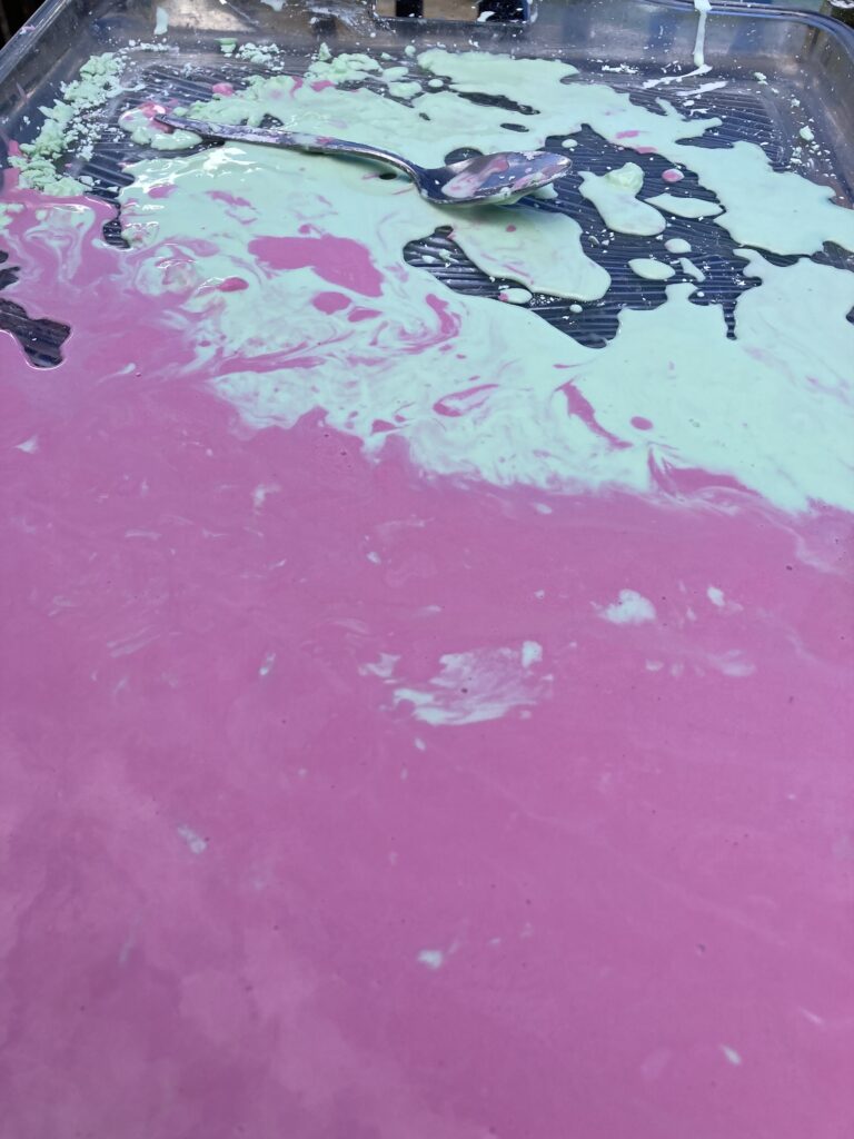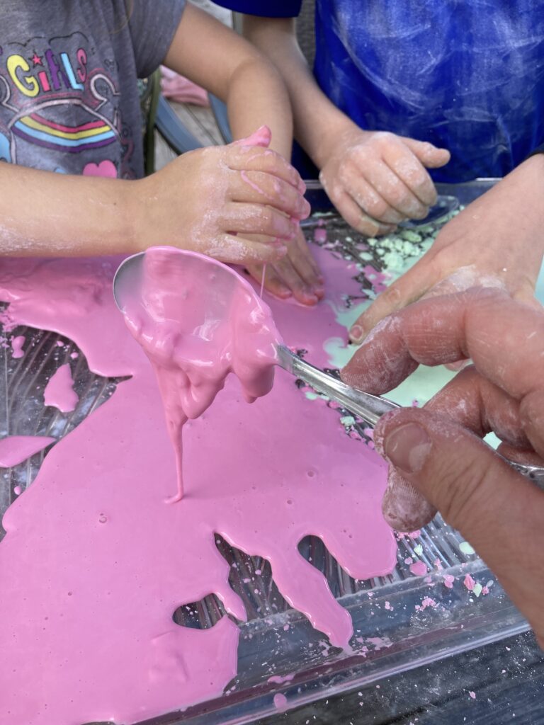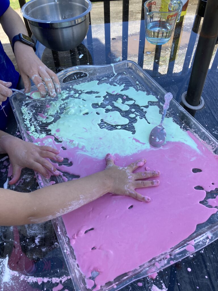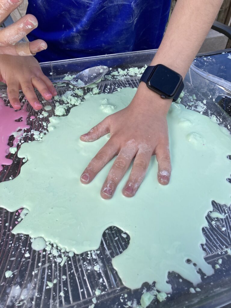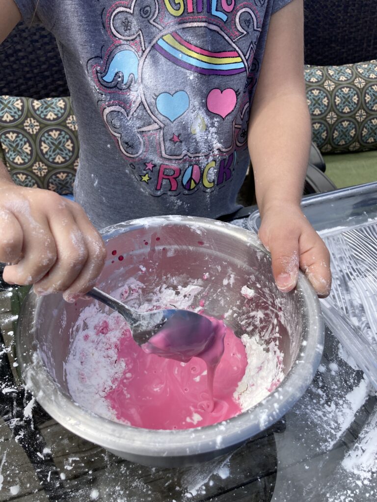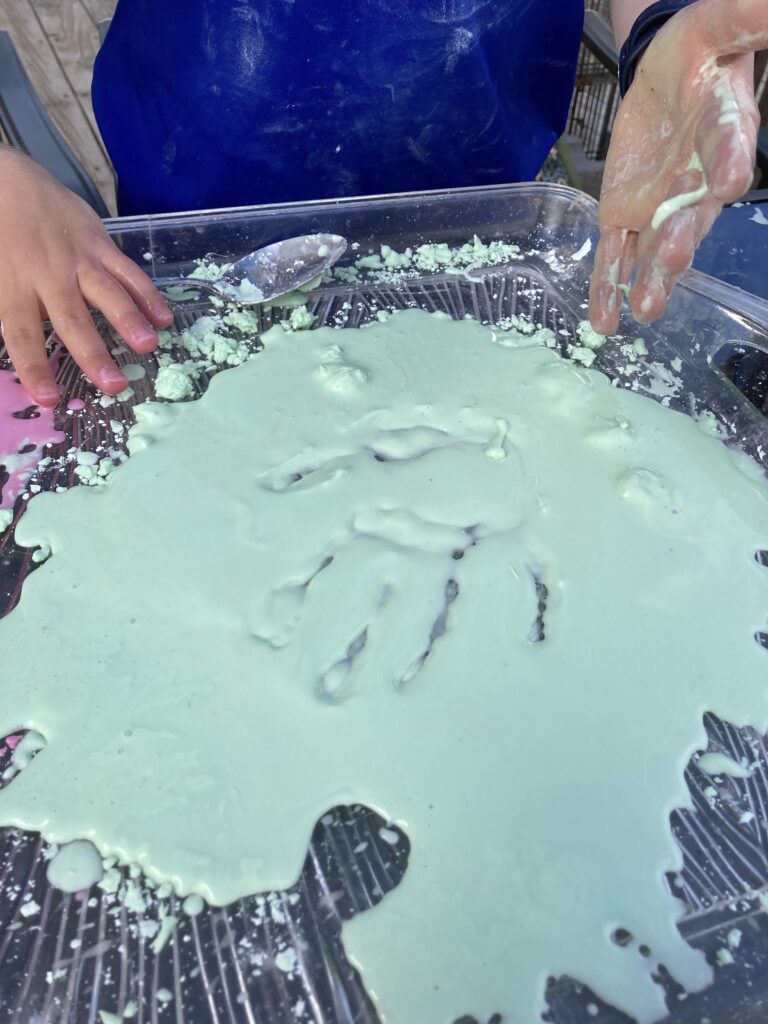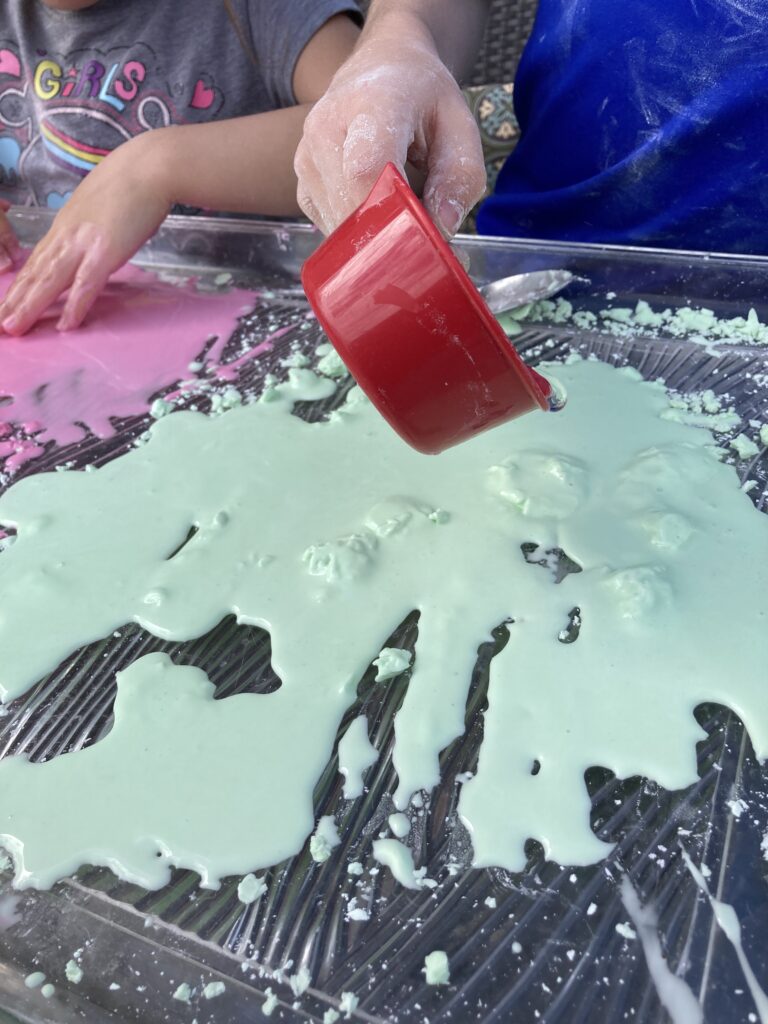 My kids poured their mixture onto a tray so that they could play around with it a bit easier and get a feel for what it does.