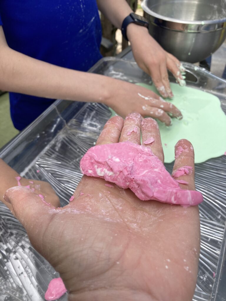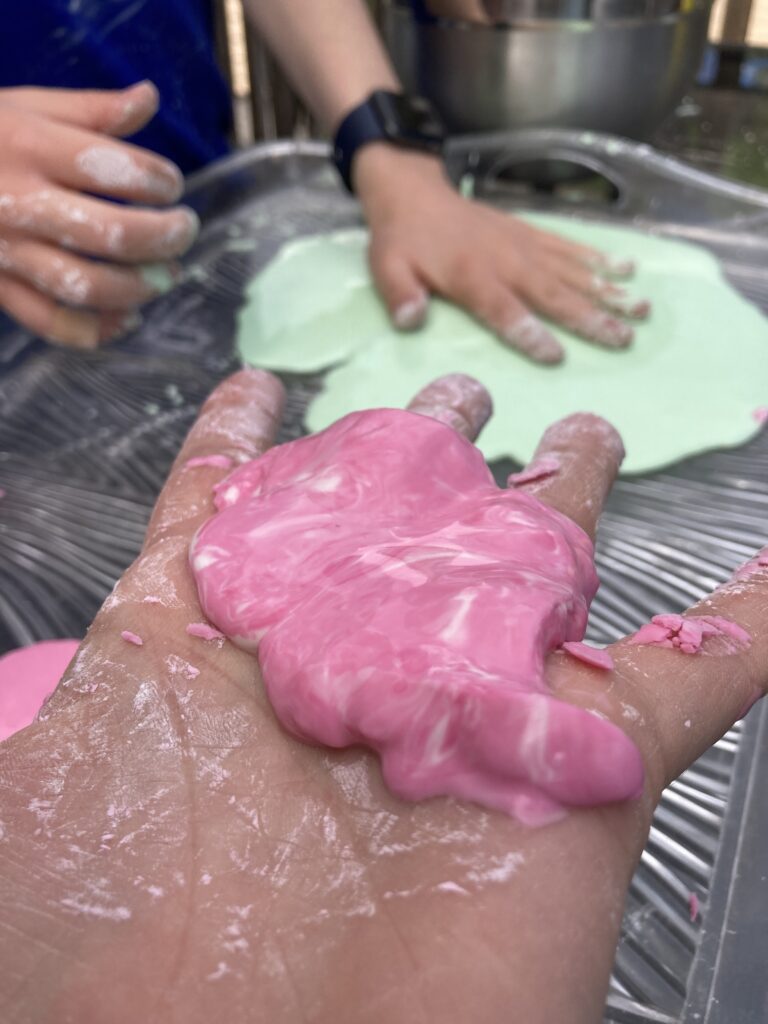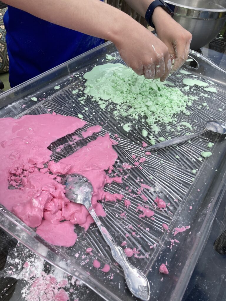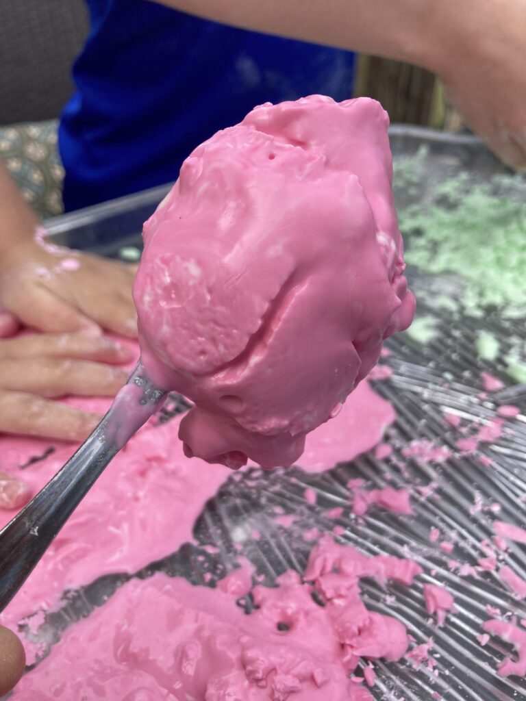 We found that when it starts to dry it goes a crumbly texture. Almost like soap if you break it into pieces. The kids used spoons as well as their hands to scoop it up.