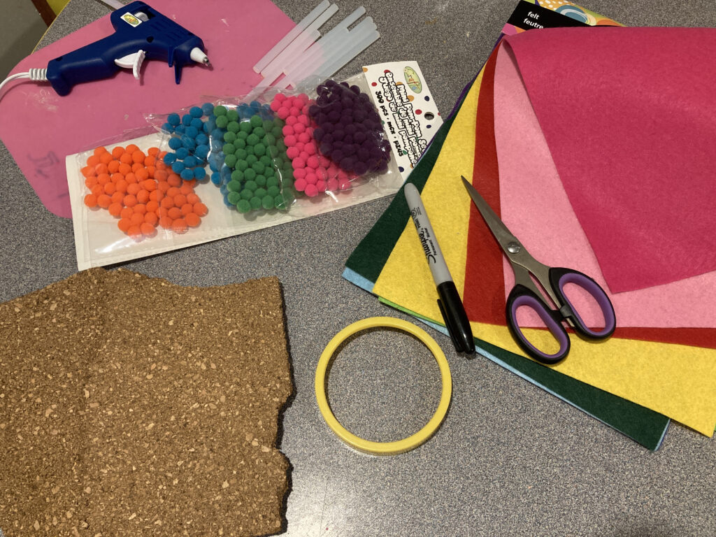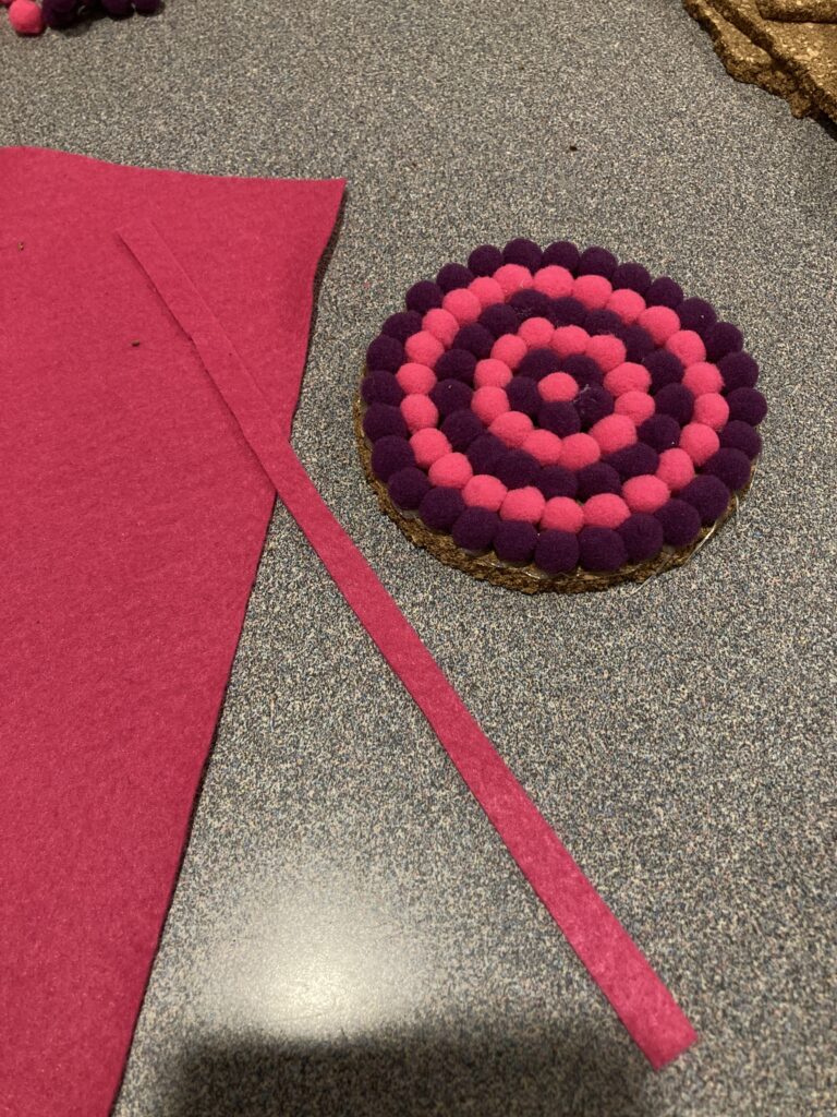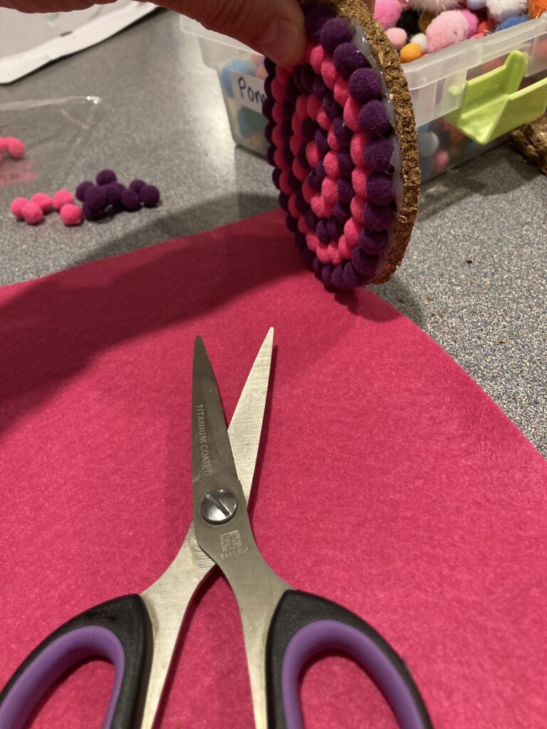 The felt is designed to tidy up your Pom Pom coaster around the edge. It just gives it a nice finish. Line up your coaster side on to see how thick your felt piece will need to be. Don’t worry if it is too wide, it can always be trimmed once it’s stuck on.