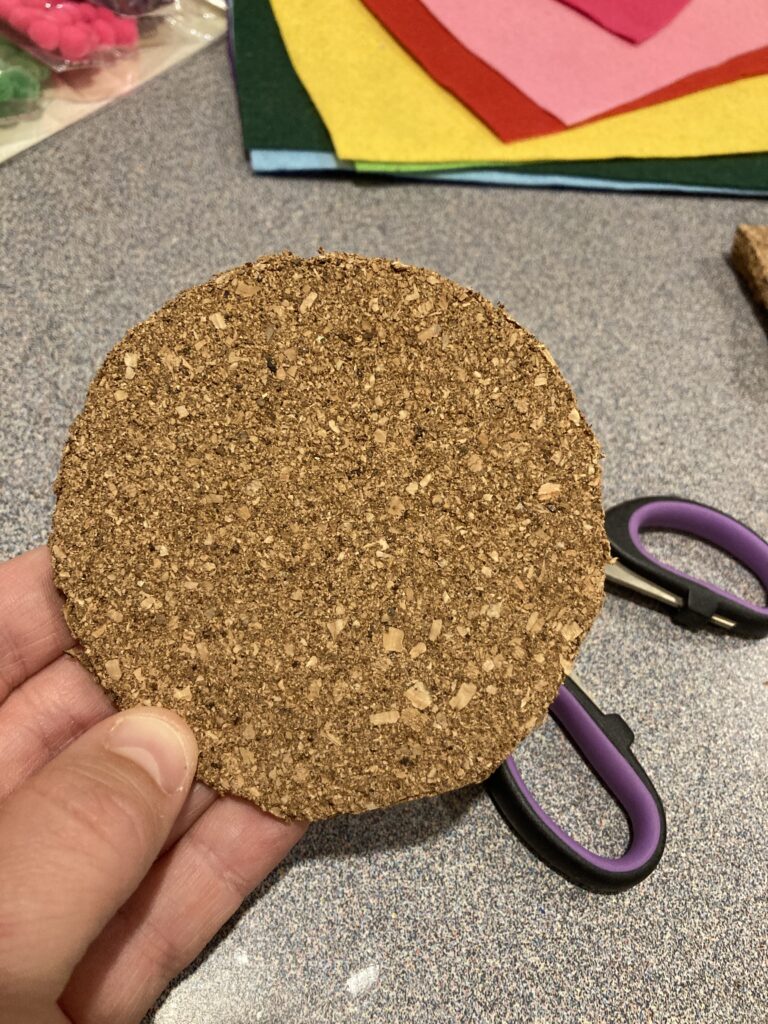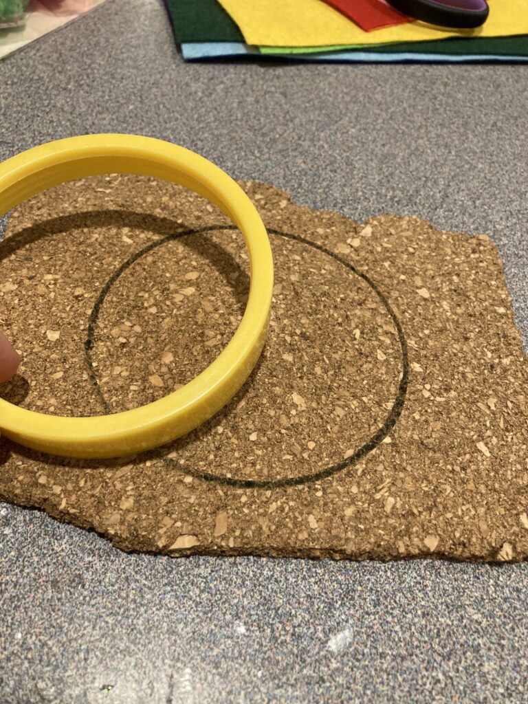 Start by drawing a circle shape onto the cork. It doesnt have to be a huge circle but big enough to sit a cup on. Using a decent pair of scissors for the cork helps.