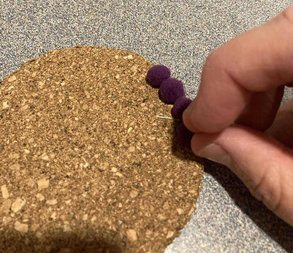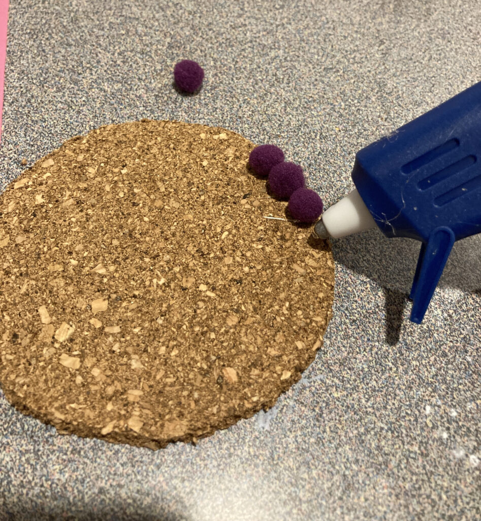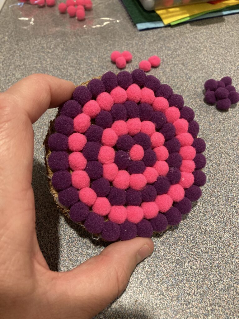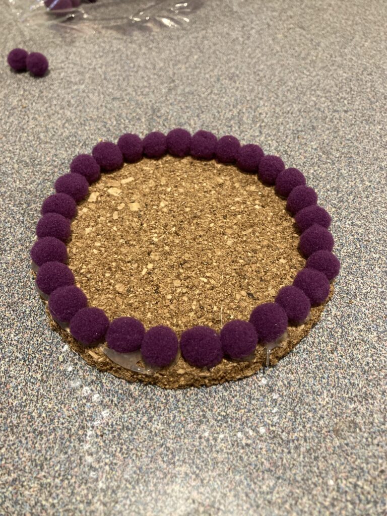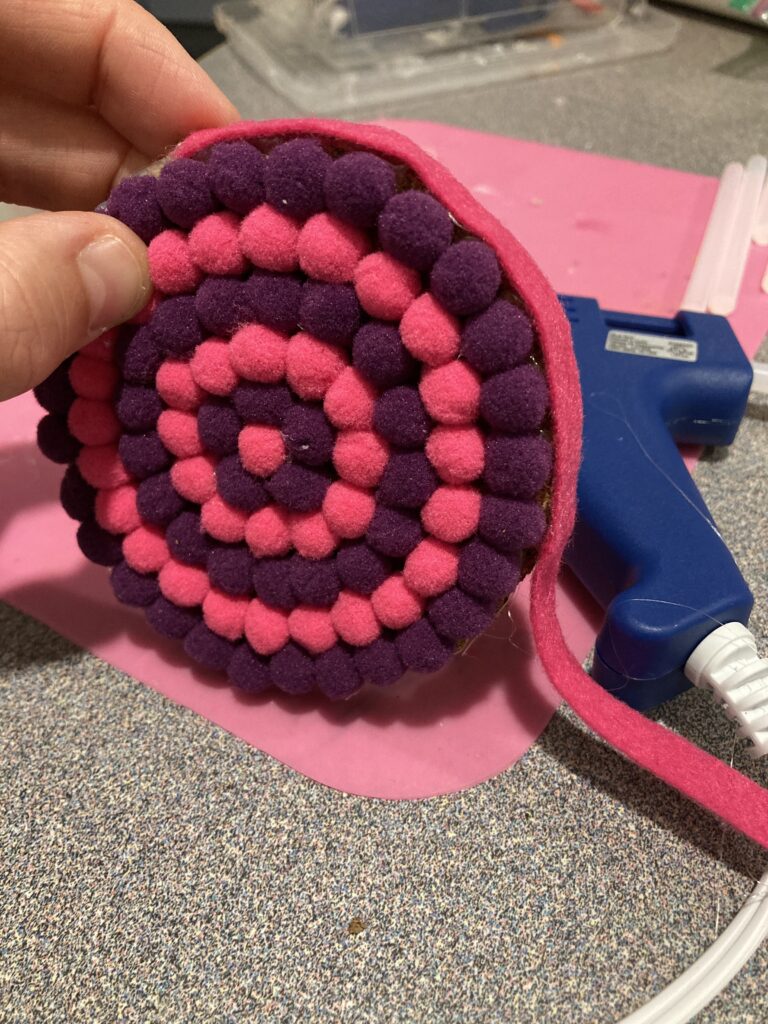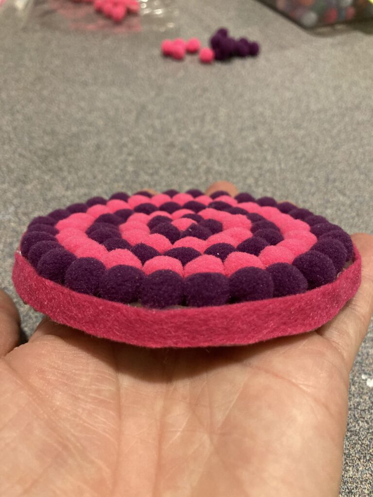 Apply a dab of hot glue at the edge of the circle and start to place your Pom Poms all the way round the circle. It’s easier to start from the outside and work your way to the middle. Going on experience, dotting them wherever makes it more difficult when filling gaps.