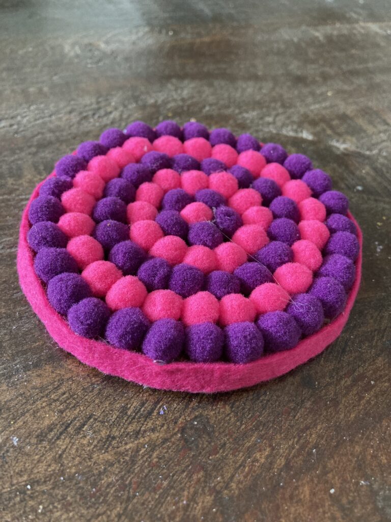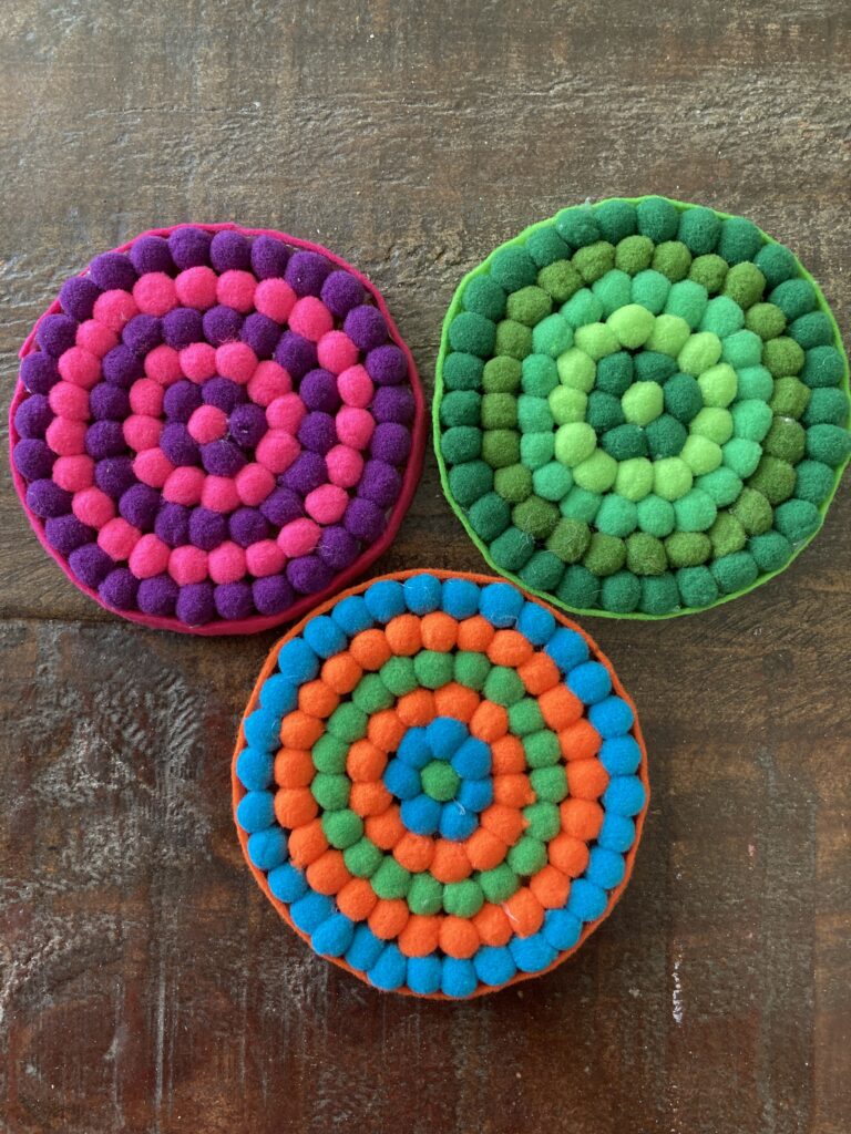 These Pom Pom coasters can be used as decorative gifts. They are more fiddly to make than a lot of other crafts that my kids and I have done. However for older kids this is a good project. The hot glue can get pretty HOT so smaller children will need help with this.