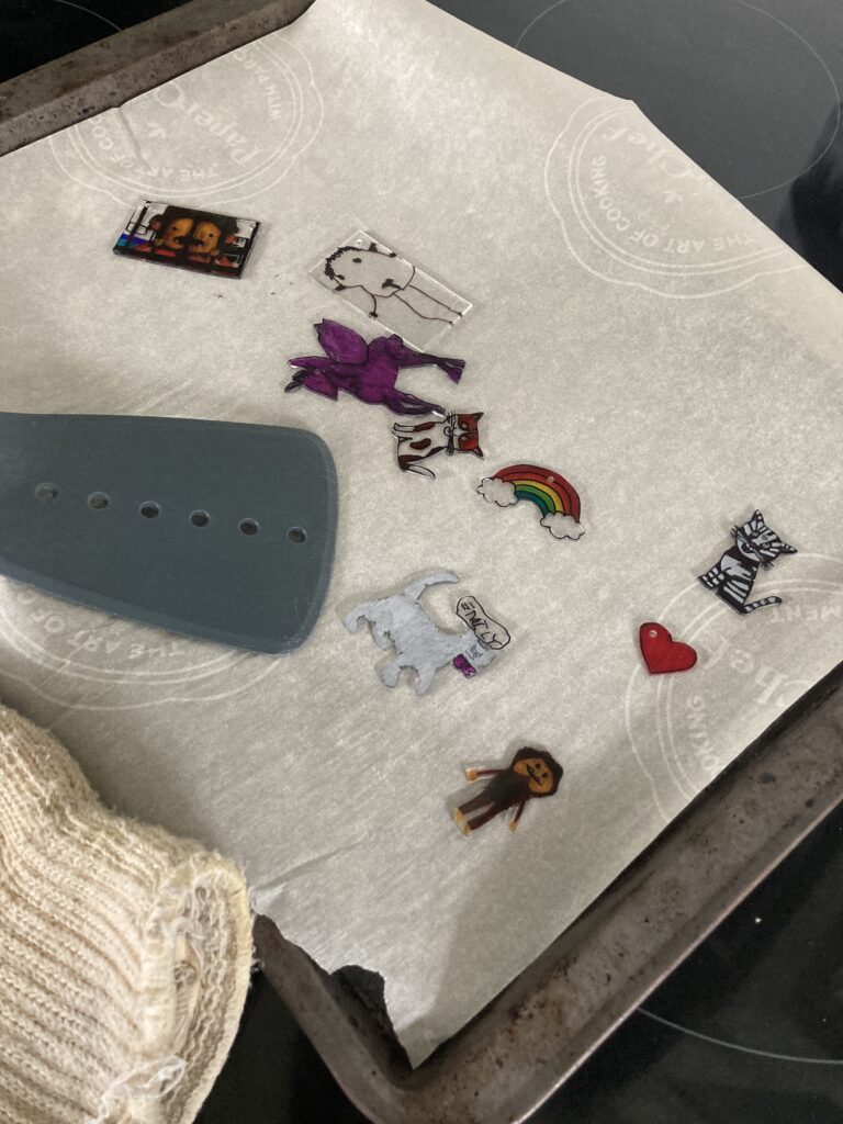 Lay all the shrinky dinks out on a baking tray so they are spaced out. Bake for 1-2 mins depending on how quickly they take shape.