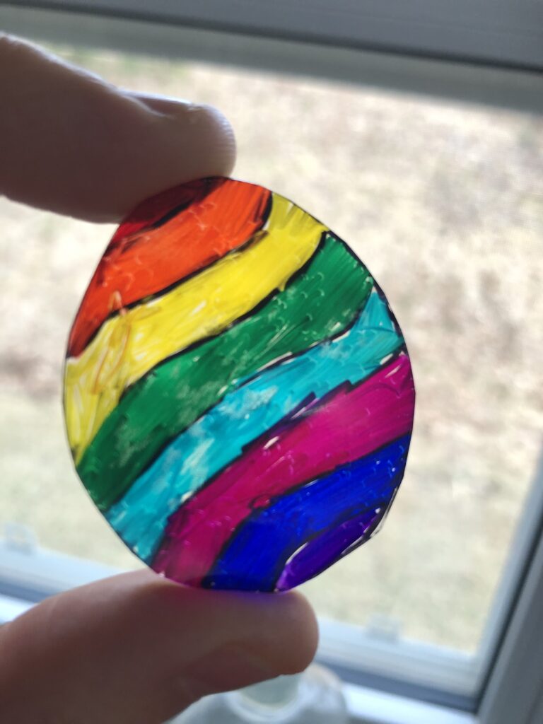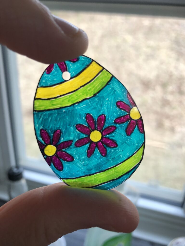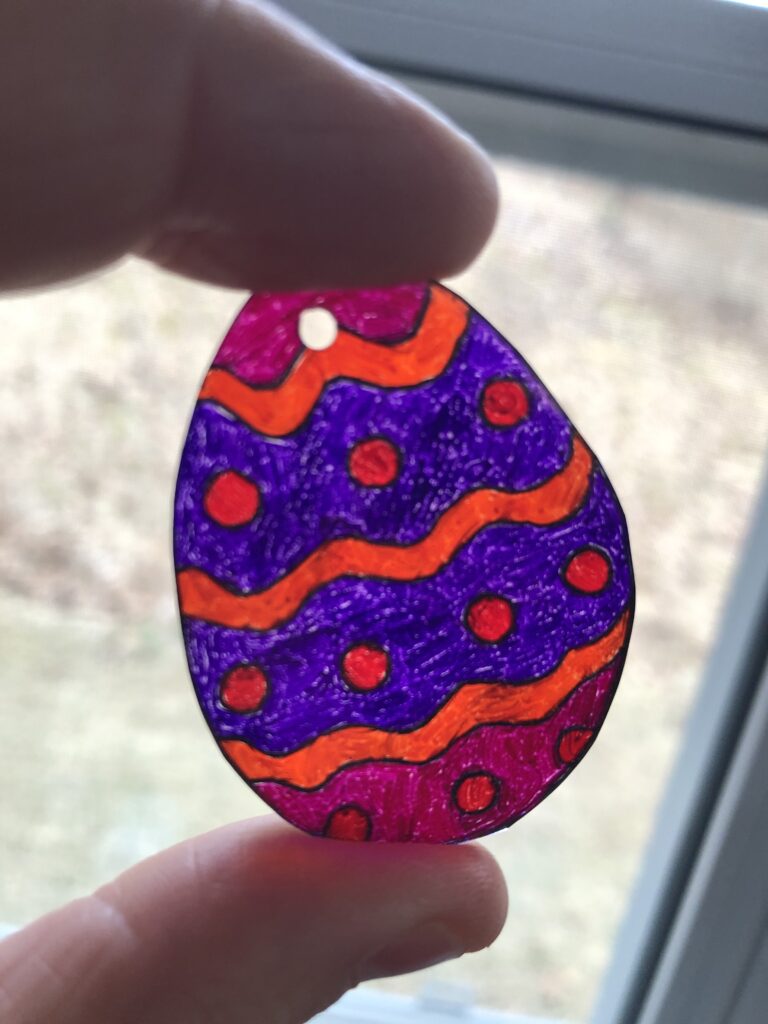 The shrinky dinks turn out so pretty when using lots of colour. We traced around some Easter egg colouring sheets and they turned out so cute. As you can see two of these have holes punched into them. These can be put on a necklace.