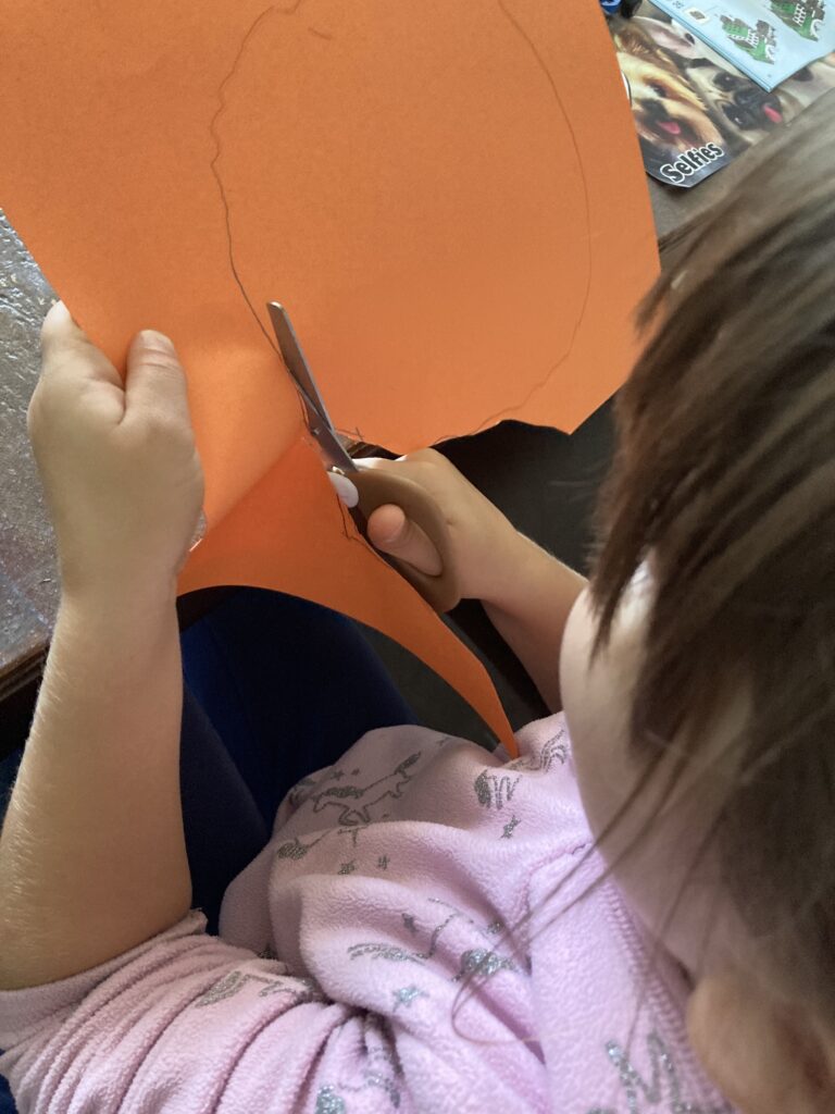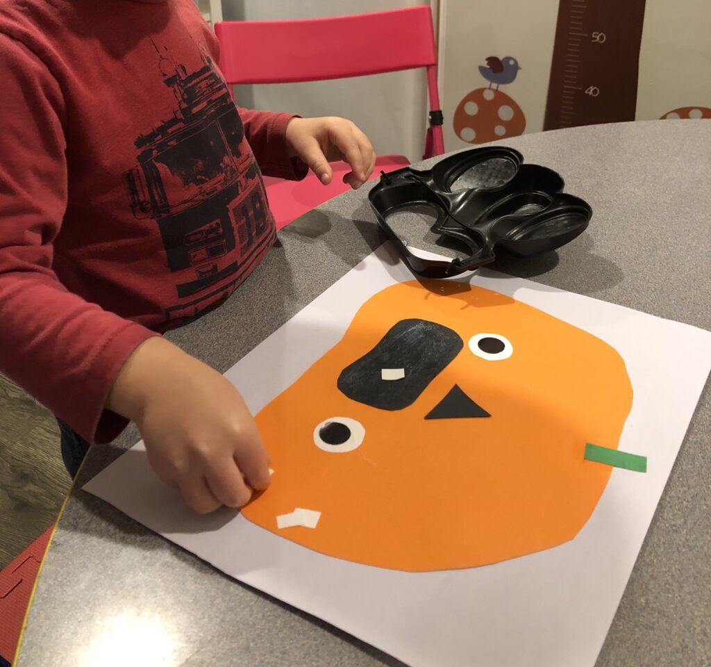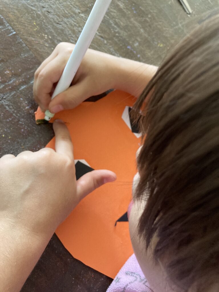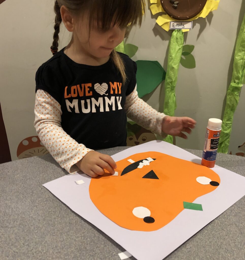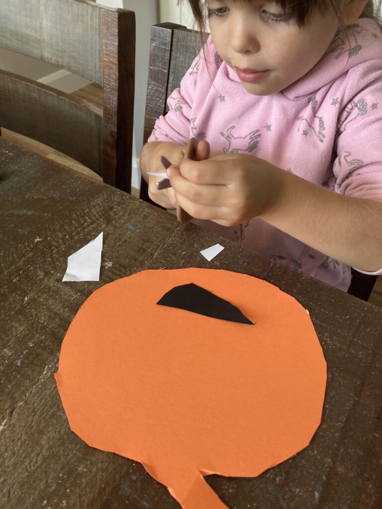 Same goes for the pumpkins eyes. There is an inside part and outside part. The black circle will generally be smaller than the white. However this is your child’s pumpkin and the beauty of doing these child led crafts is that there is no right or wrong way. So your child can go to town making their smiley pumpkin how they want it.