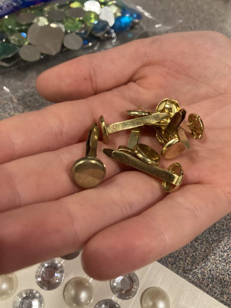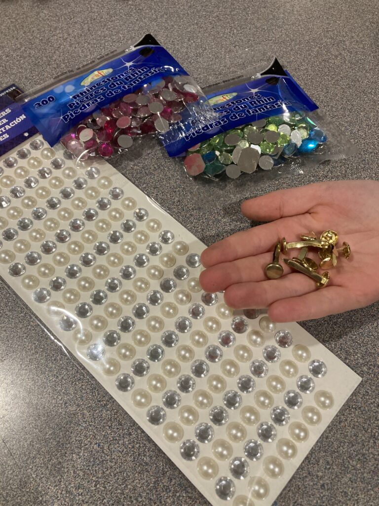 For this craft all you need are brads and some shiny rhinestone gems. These are usually available at craft stores. We had some stick on gems which are very easy to apply. We also had some other gems which we had to glue on. If you have hot glue, the gems will stick better. So adult supervision is needed for this craft when using none stick on gems.