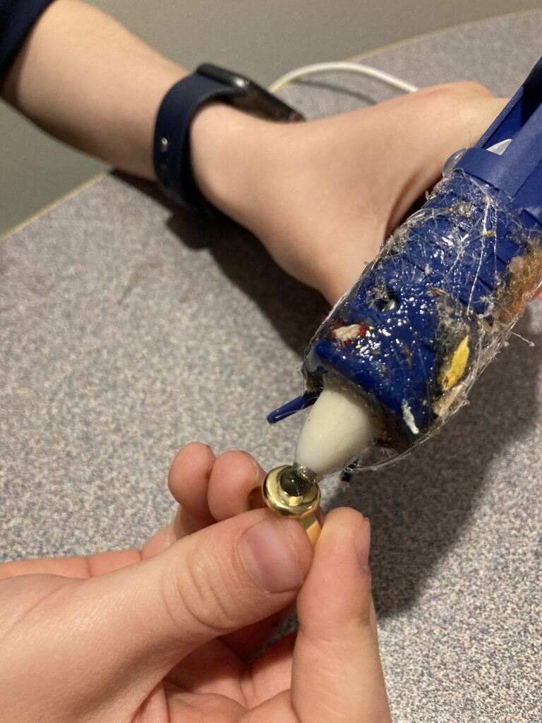 Make sure that the hot glue has warmed up so the glue comes out easily. Apply a small amount on the top part of the brad. Just enough to apply the gem- not too much! Carefully stick on the gem and hold it in place for about 5 seconds, watching not to burn your fingers. The hot glue dries pretty quick.