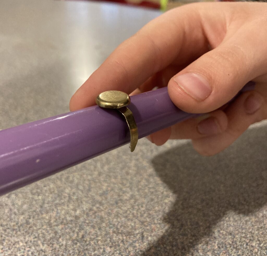 The trickiest part of this craft is getting the brad into a ring shape that will easily slide onto little fingers. We used a marker and wrapped the brad around to acquire a ring shape.