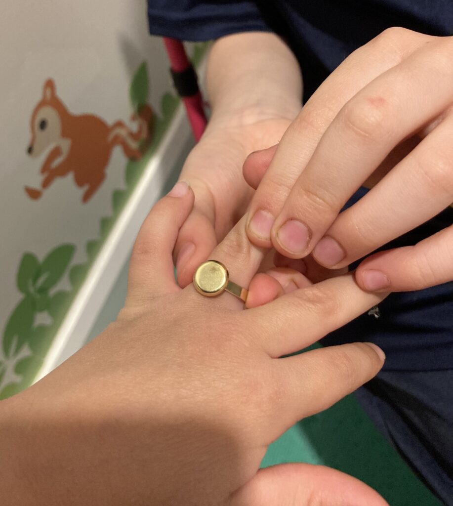My son wrapped the brad around his sisters finger to measure it for size. I will point out that the brads are small so these rings are more for little fingers.