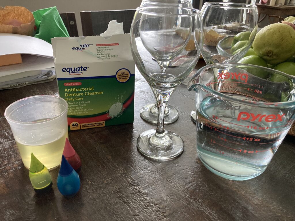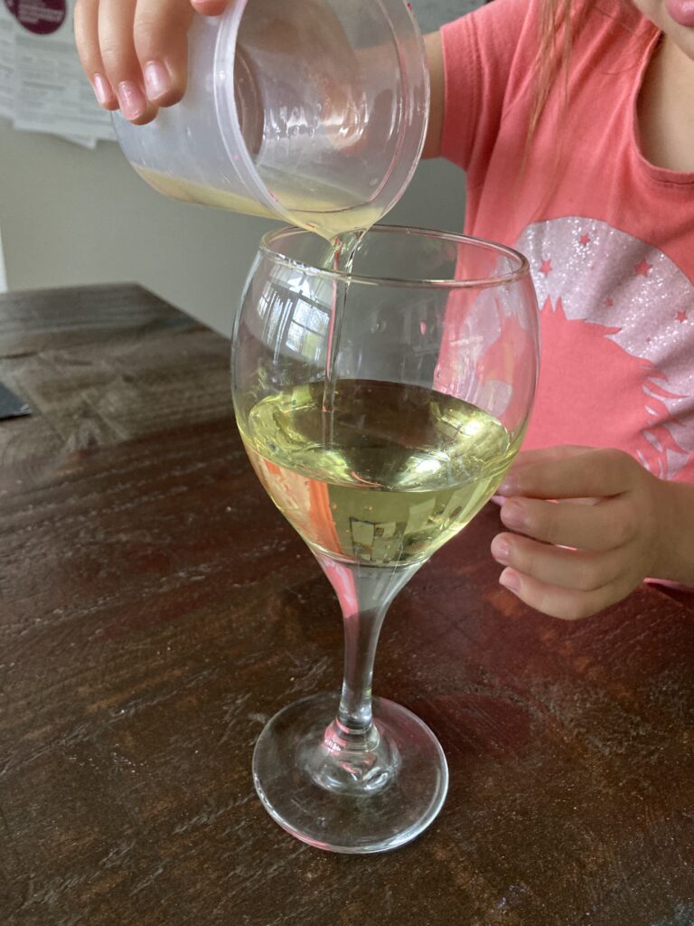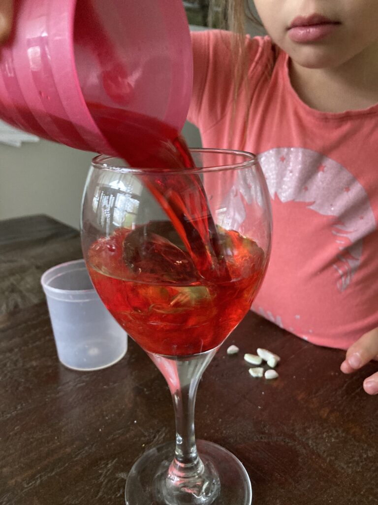 Meanwhile break up your tablet/alka-seltzer into 3-4 pieces. You don’t have to wait for the water to settle. You can go ahead and throw the pieces of tablet into the glass whenever your ready. My kids couldn’t wait lol. 😆