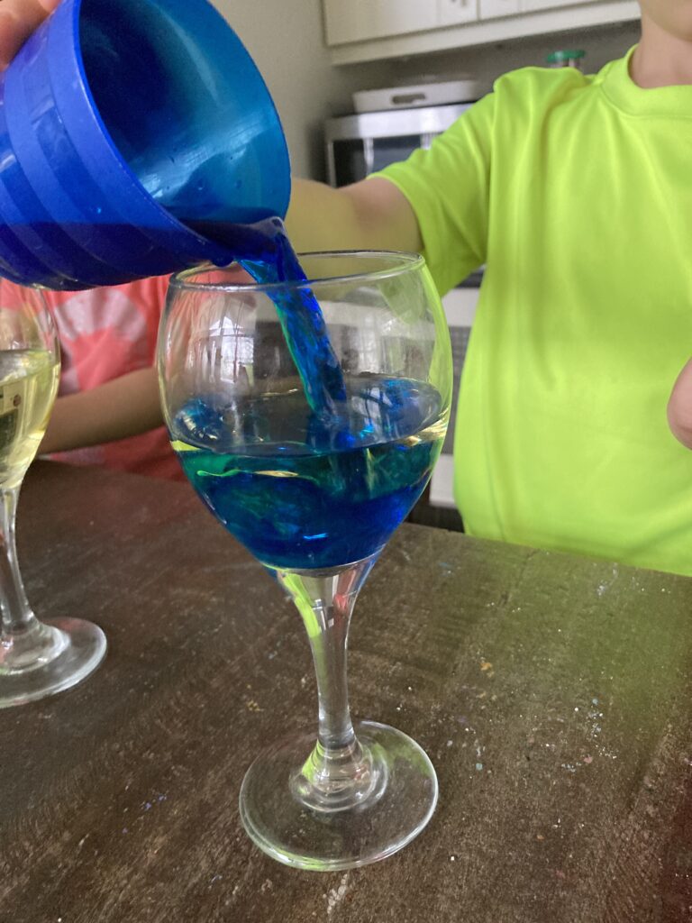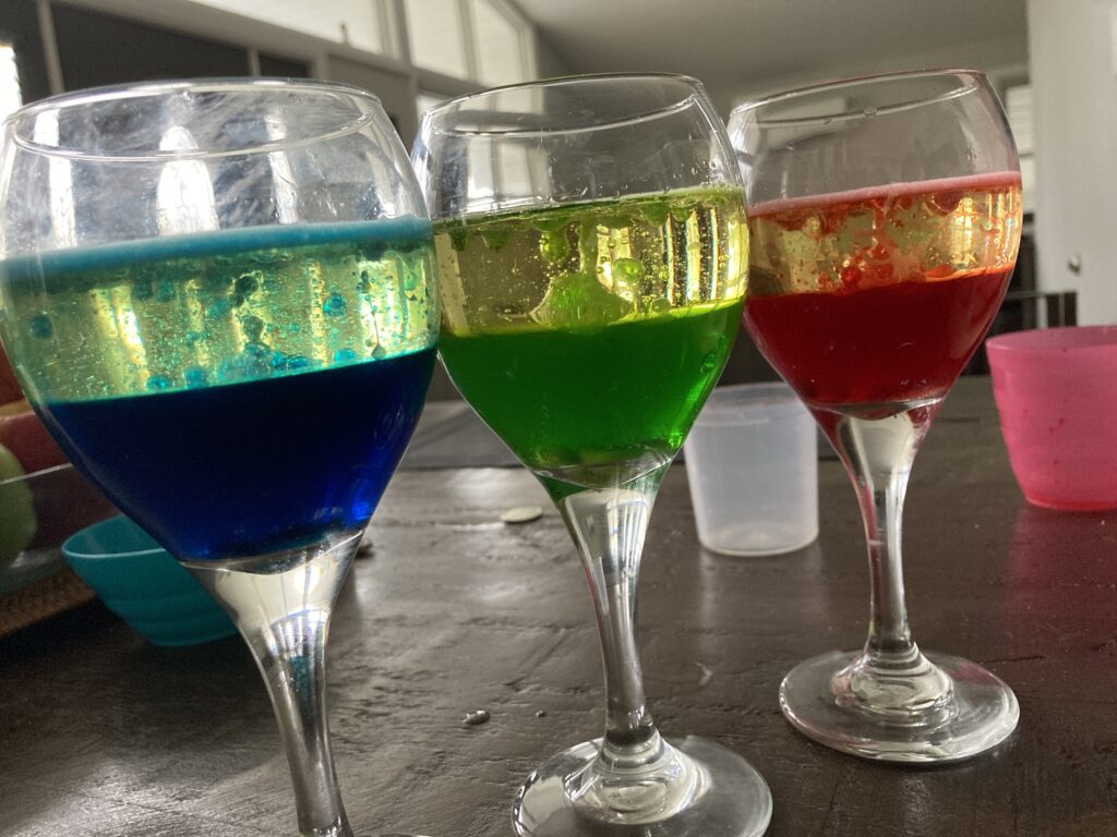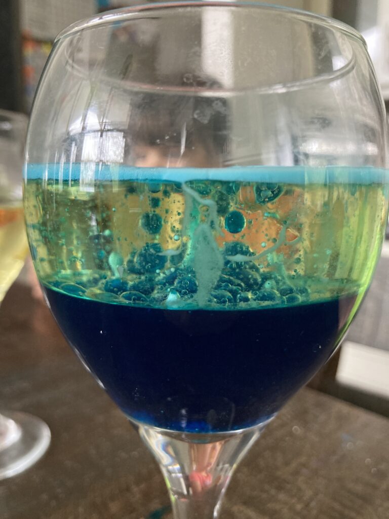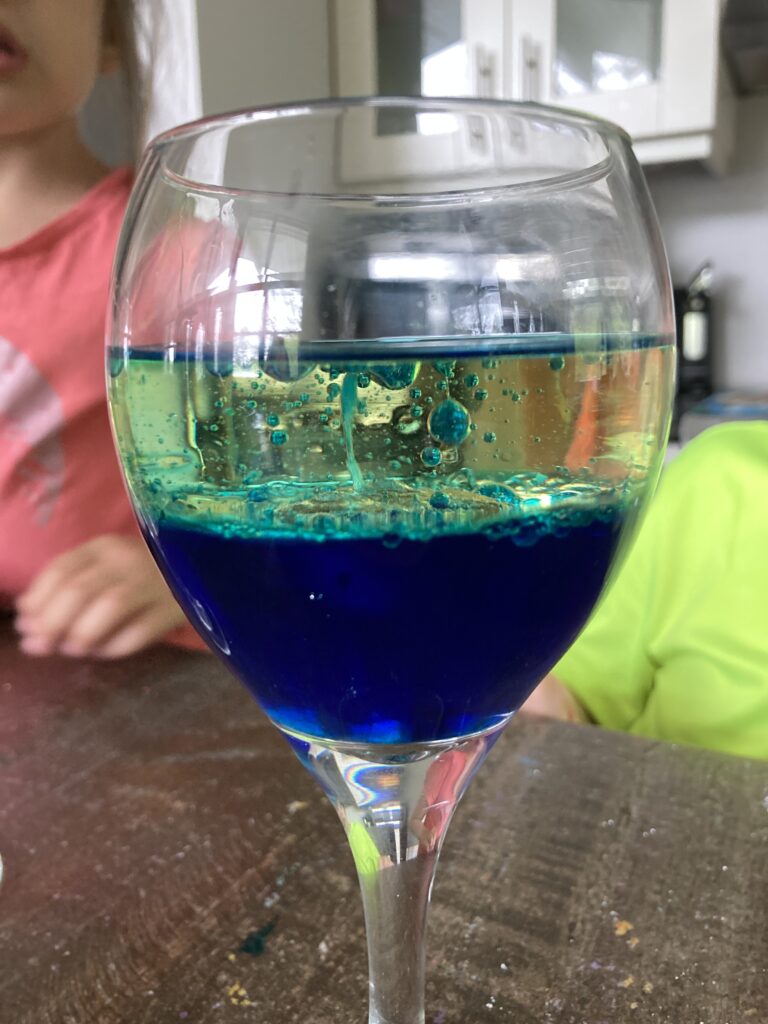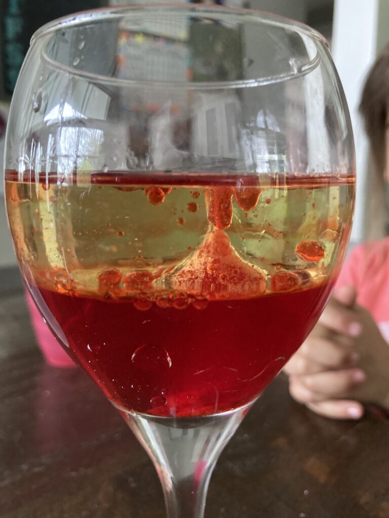 *I will point out that doing this experiment in a different really made a difference. We found that when we added the water first, it didn’t have the same effect and it was a bit disappointing. Then we tried it again adding the oil first and we had a totally different outcome.
