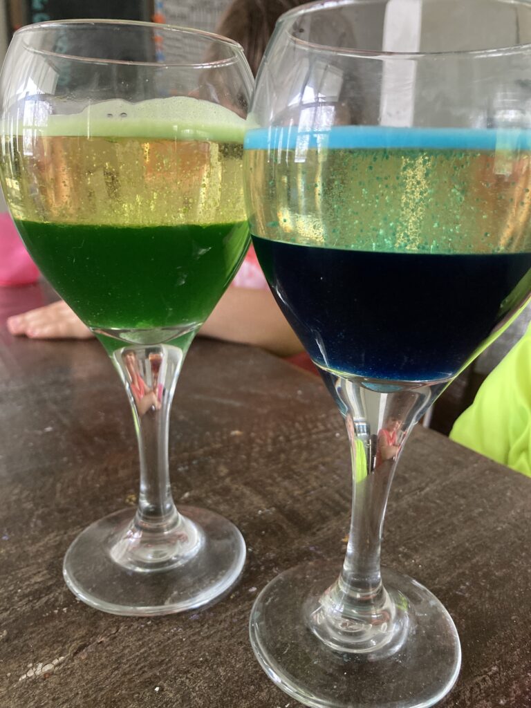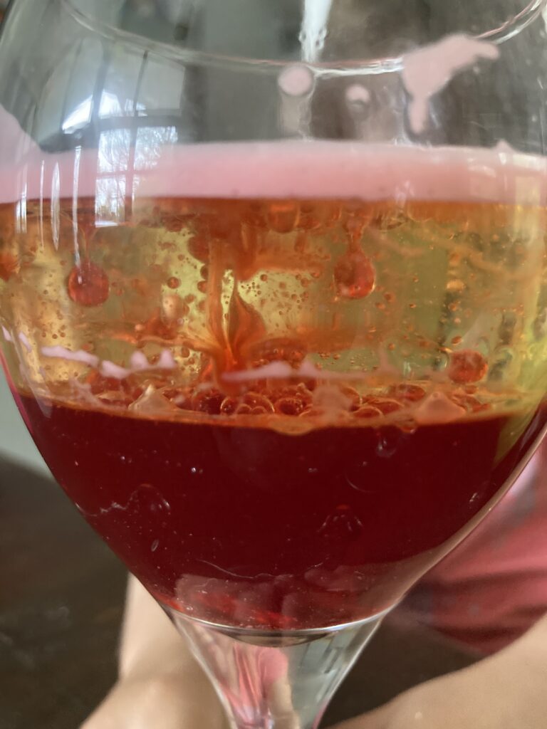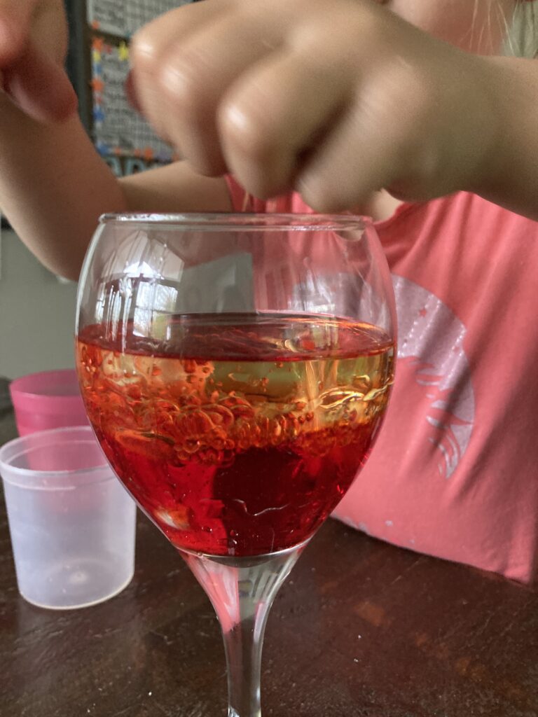 The tablet started creating bubbles between the oil and the water. It didn’t erupt but as we watched it through the glass, we did see some ‘erupting’ going on where the bubbles were forming. Hence where the name comes from. They looked just like little lava lamps!